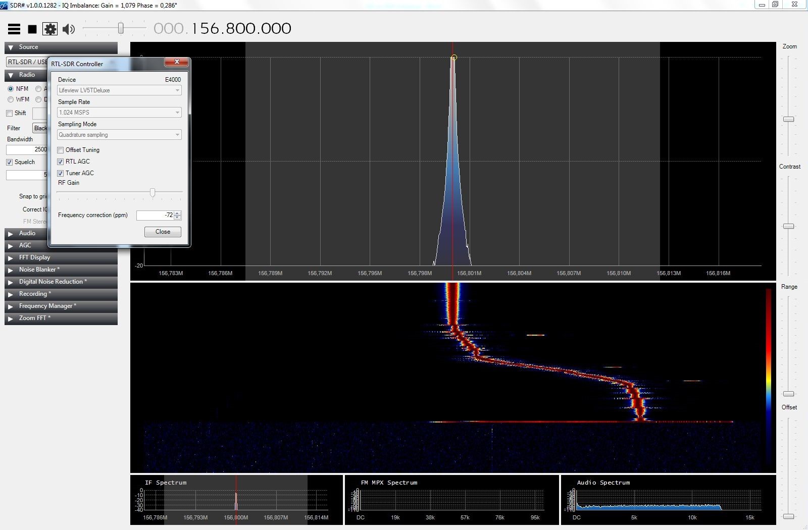 Wywołujemy okno konfiguracji urządzenia (trzeci przycisk od lewej na pasku) naciskamy przycisk nadawania i wartością w polu Frequency correction (ppm) okna konfiguracyjnego staramy się sprowadzić prążek do częstotliwości 156,8MHz jak widać poniżej: