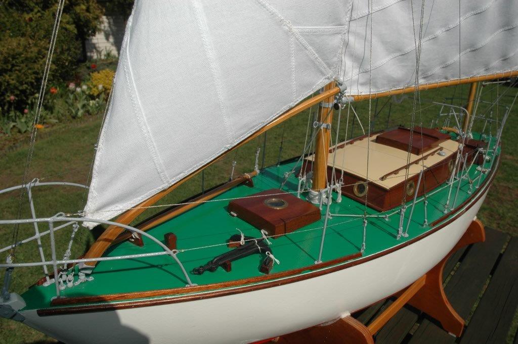 Z uwagi na to iż model jest pływający, żagle - fok, grot i bezan - sterowane są ruchomymi szotami. Starałem się by przebieg tych lin odpowiadał
