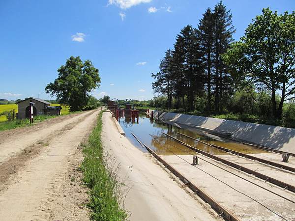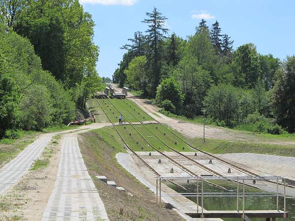 Na sześć dni przed terminem uruchomienia pochylnie wyglądają na gotowe, tylko jeszcze wody jak by brakowało. Sróbowano zaradzić wpadającym prostopadle do kanału strumieniom wody z pod kół napędowych, zobaczymy jak się to sprawdzi. Odbojnice wprowadzające na wózki też gumowe, tylko krawędzie pomostów przy wózkach nadal obite stalą. Monitoring plus światła sygnalizacyjne trochę zmieniają zabytkowy charakter urządzeń, a jakoś się bez nich dotychczas obywało.