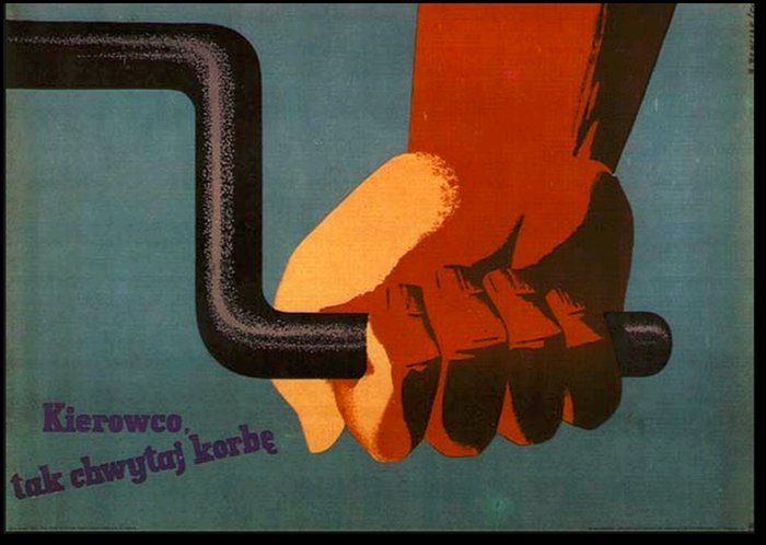 Oczywiście najlepiej byłoby uruchomić silnik i po sprawdzeniu instalacji rozpocząć normalny cykl ładowania. Ale nie możemy wykluczyć, że padnie również akumulator rozruchowy. Jak wiecie, jestem zdecydowanym przeciwnikiem korby rozruchowej nawet w silnikach małej mocy. Na jachcie jest ciasno i wyjątkowo łatwo jest sobie zrobić krzywdę w postaci dość skomplikowanych złamań kości: nadgarstka (ossa carpi), promieniowej (ossa radius), łokciowej (ossa ulna) – rzadziej przedramienna (humerus). Nie chodzi o to, że korba nie wypnie Wam się po uruchomieniu silnika (choć zdarza się to wcale nie tak rzadko, ponieważ w ciasnej przestrzeni zejściówki łatwo jest ją przekosić przy kolejnym obrocie), ale przede wszystkim dlatego, że silnik może odbić potężnie w drugą stronę. Mechanizm jest prosty. Przy kolejnych obrotach wału wtryskiwacze podawały paliwo nad tłok. Ale prędkość koła zamachowego była za mała, aby temperatura sprężonego powietrza była wystarczająca dla zapłonu. Jednak jesteście uparci i - wolno bo wolno - przepychacie tłok przez punkt górnego zwrotu. Temperatura cylindra rośnie, Wasze zmęczenie też. Przy którymś szarpnięciu będzie ona wystarczająca, aby zainicjować zapłon – ale prędkość tłoka będzie na tyle mała, że wybuch popchnie go z dużą siłą w drugą stronę. KORBA JEST WTEDY ZAZĘBIANA. Jeżeli dodatkowo diabeł kazał Wam objąć rączkę kciukiem – to nieszczęście macie jak w banku. Na wszelki wypadek przypomnienie na rysunku jak chwytamu korbę – mam nadzieję, że na widok oryginalnego plakatu z dawnej bazy transportowej łza się zakręci w oku starych szoferaków… Eh, kto z Was pamięta rozruch korbą Stara 21 z przemyślaną w szczegółach benzynową czterolitrówką Jana Wernera i Jerzego Jędrzejewskiego?