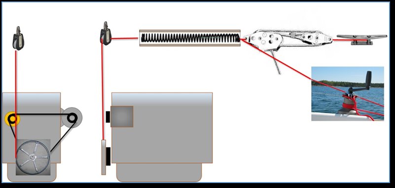 5. Drugi sposób: jeżeli nie uda się linki wyprowadzić na nok bomu – to dużo łatwiej jest wyrzucić za rufę dryfkotwę lub dwa-trzy związane wiadra. Pamiętajmy o wpięciu między linkę rozruchową, a główną linę pociągową cienkiej linki, która w przypadku gdyby linka rozruchowa nie zeszła z koła (nigdy mi się to nie zdarzyło) zadziała jak bezpiecznik