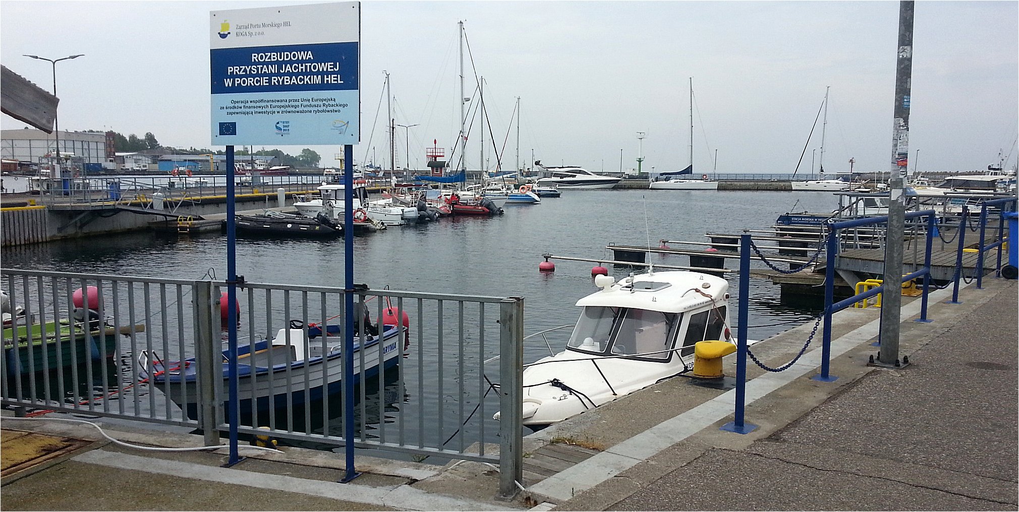 Dużymi literami - PRZYSTAŃ JACHTOWA, a małymi - że to wsparcie UE dla naszego rybołówstwa