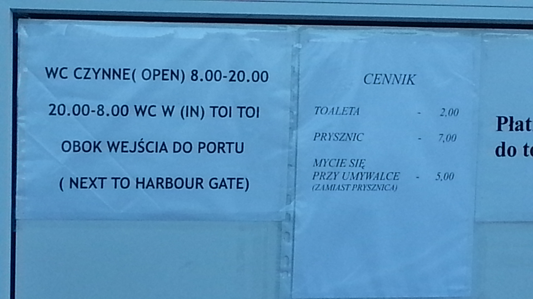 Władysławowo - trudno mówić o marinie, to raczej miejsce wydzielone dla jachtów w porcie rybackim. Samo miejsce zresztą jest więcej niż przyzwoite. Porządny pomost z y-bomami, na którym, jest woda i prąd, obsługa miła i pomocna. Nie mniej wrażenie z Władysławowa jest słabe. A to z powodu toalet i pryszniców. Nie dość, że słono płatne (osobiście uważam pobieranie opłat z toaletę za barbarzyństwo), to jeszcze czynne do 20 (w sezonie podobno do 22), a co potem? Korek w d...? Toalety i prysznice to jakaś ajencja i ma w nosie żeglarzy. Na szczęście można się dogadać z obsługą "Szkunera" i skorzystać z toalet u dyspozytora portu. Ale to opcja grzecznościowa. Mnie się udało.