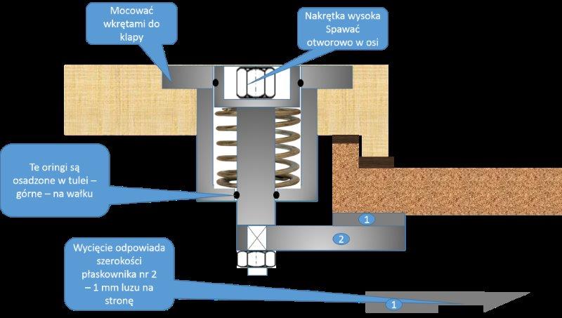 Wracając do konstrukcji. Na owrężu otworu przygotowane jest okucie oznaczone nr 1. Obracany i lekko naciskany rygiel po obróceniu wskakuje w zatrzask. Zamknięcie jest pewne i mocne – o sile docisku klapy do uszczelek decyduje użyta przez Was sprężyna. Jeżeli uznacie po próbach, że jest nieco za słaba – podłóżcie podkładki.