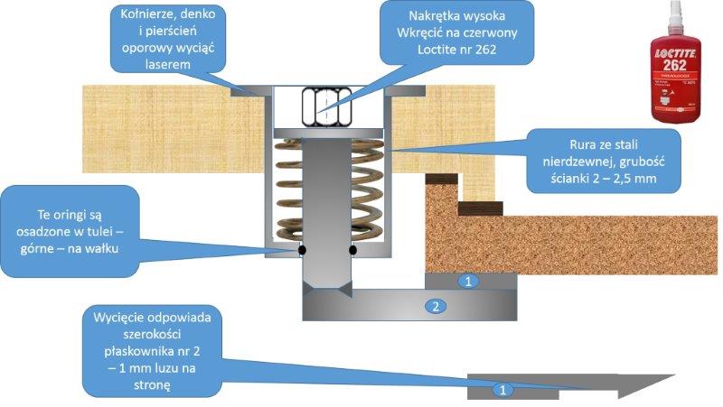 Wykonanie jest proste. Z wałka toczymy w jednym przebiegu tuleję z kołnierzem. Z tym samym zamocowaniu wytaczakiem wykonujemy rowki pod dolny oring uszczelniający przejście wałka. Następnie wytaczamy wałek z górnym kielichem, w środek którego wspawujemy dobrej jakości wysoką nakrętkę pod klucz 13. Koniec wałka ma sfrezowany kwadrat pod prostokątny otwór wykonany w ryglu (element nr 2). Rygiel mocujemy nakrętką z podkładką sprężystą.