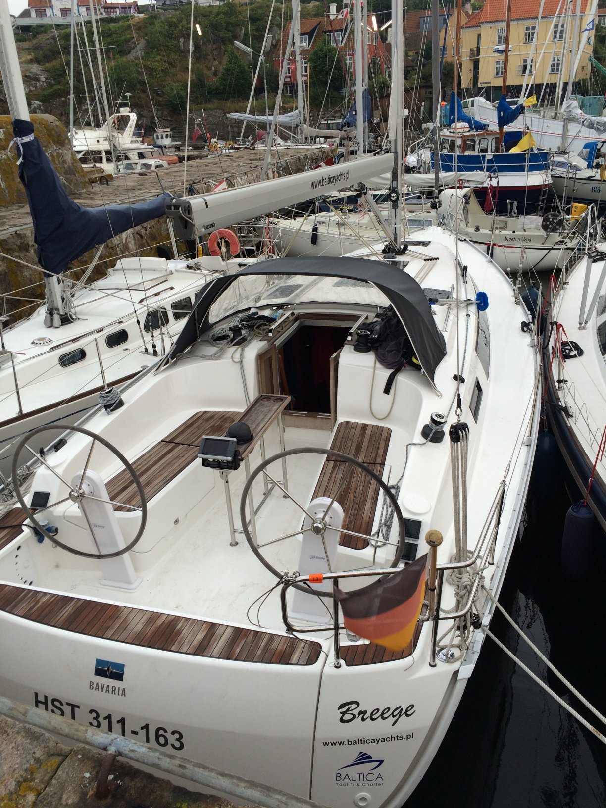 Nasze podejście burtą udało się za pierwszym razem, chłopcy wprawieni kilkoma wcześniejszymi portami błyskawicznie założyli wszystkie cumy i szpringi. Idąc za radą mędrców, podchodząc burtą pod odpychający nas wiatr, zawsze używamy najpierw brestu ze śródokręcia (nazywanego też szpringiem holenderskim), w drugiej kolejności zakładając szpringi dziobowy i rufowy, a na końcu cumy. Nie piszę tego, aby kogokolwiek uczyć - a szczegółowy sposób podaję tylko po to, aby dzielić się doświadczeniem (także w zakresie popełnianych błędów) z każdym, kto chciałby poznać jak żeglują inni.