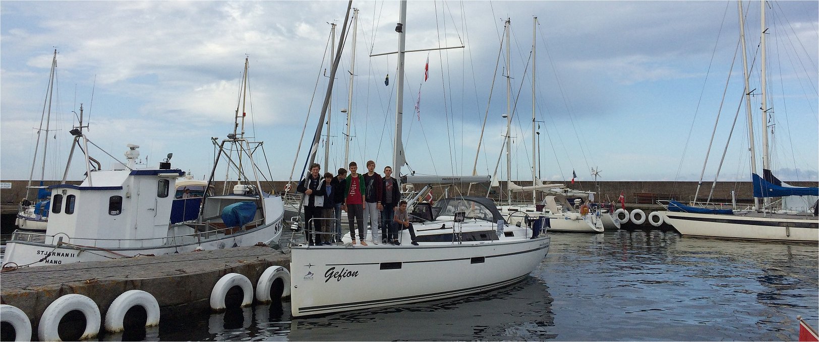 Kolejnym naszym celem stała się wysepka Hanō leżąca dokładnie na północ, o 45 mil od Bornholmu. Wyszliśmy o 0810, wcześniej podpływając na drugą stronę basenu do żółtego węża z wodą. Mimo prognozowanego słońca i lekkiego wiatru nie przekraczającego 3B niebo zasnuły chmury, przyszła mokra kurzawa, a wiaterek wzrósł do regularnej piąteczki. Tak posuwając się w prędkością 6w przekroczyliśmy na szczęście niezbyt ruchliwą tego dnia rutę dla dużych statków, nie będąc ani razu zmuszeni do zmian kursu i ustępowania z drogi. Niestety, za rutą wiatr zaczął zdychać, więc chcąc utrzymać założoną minimalną prędkość musieliśmy posiłkować się silnikiem. Na pocieszenie wyszło słońce oświetlając pięknie zbliżające się brzegi Szwecji. Wyspa wyróżniała się wyraźnie w perspektywie północnego brzegu zatoki ułatwiając młodym żeglarzom trzymanie kursu.