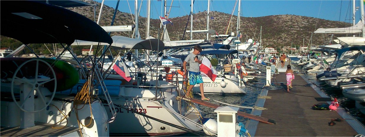 Przez 2 tygodnie zrobiliśmy ok. 250 mil. Nie są to duże przebiegi, ale trzeba pamiętać, iż pływaliśmy rodzinnie, z dziećmi, można by rzec – po mazursku. Jednak warto też zaznaczyć, iż Adriatyk to nie Mazury i bez prowadzenia dokładnej nawigacji można wpędzić się w nie lada kłopoty. Wybrzeża są skaliste, wśród rojów wysepek zdarzają się kamienne mielizny, w dodatku nie wszystkie oznaczone – tak więc pływanie wyłącznie na wzrok byłoby wielce ryzykowne. Jachty także nie są mazurskie, dość powiedzieć, iż nasza 12 metrowa, ważąca ponad 8 ton Delphia, była zazwyczaj jedną z najmniejszych jednostek w tamtym rejonie. Wiele jest katamaranów, wiele 50 stopowych krążowników. Dużą cześć jednostek rekreacyjnych stanowią wielkie, kilkupiętrowe motorówy.