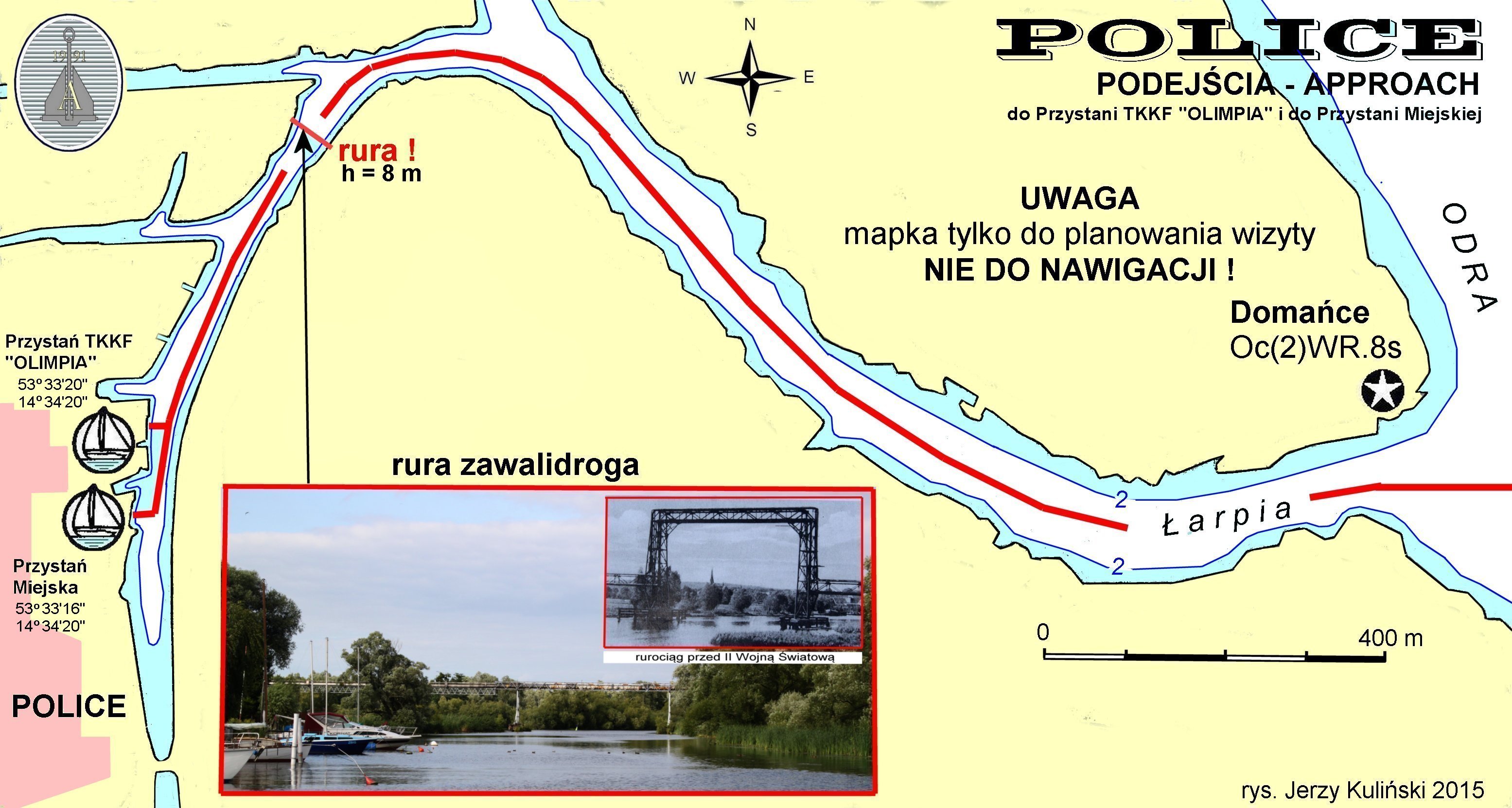 Planiki obu przystani zamieszczam w tekście. Kiedy je pokazałem przyjaciołom - od razu usłyszałem pytanie: no dobra, dobra, tylko gdzie u diaska są one położone ? Pytanie na miejscu, bo płynąc Odrą, mijając Police - owych przystani jachtowych z wody nie widać. Trzeba było więc jeszcze dorysować orientacyjną mapkę podejściową. Na mapce ta fatalna, wspomniana wyżej rura-zawalidroga jest umiejscowiona.