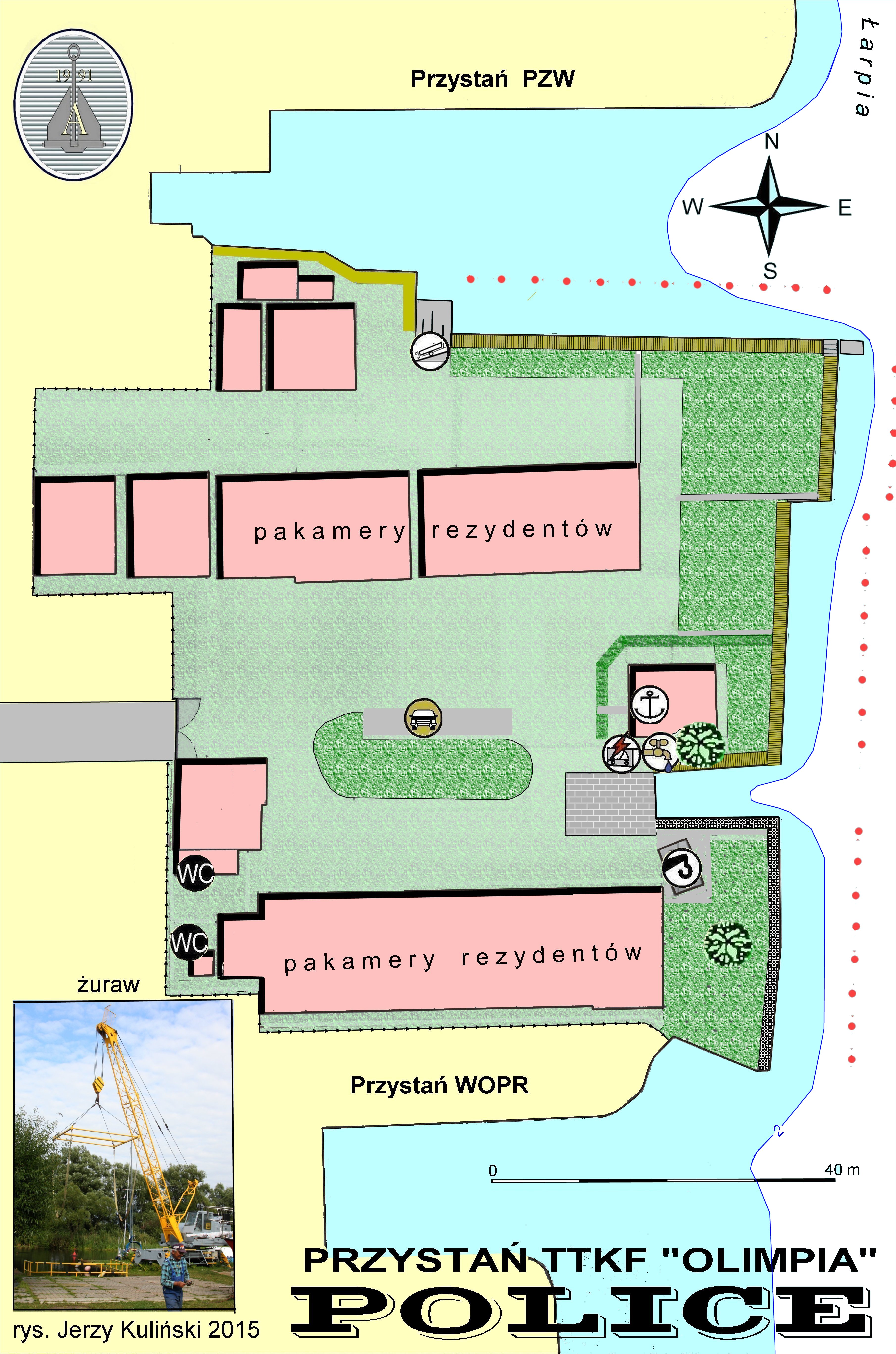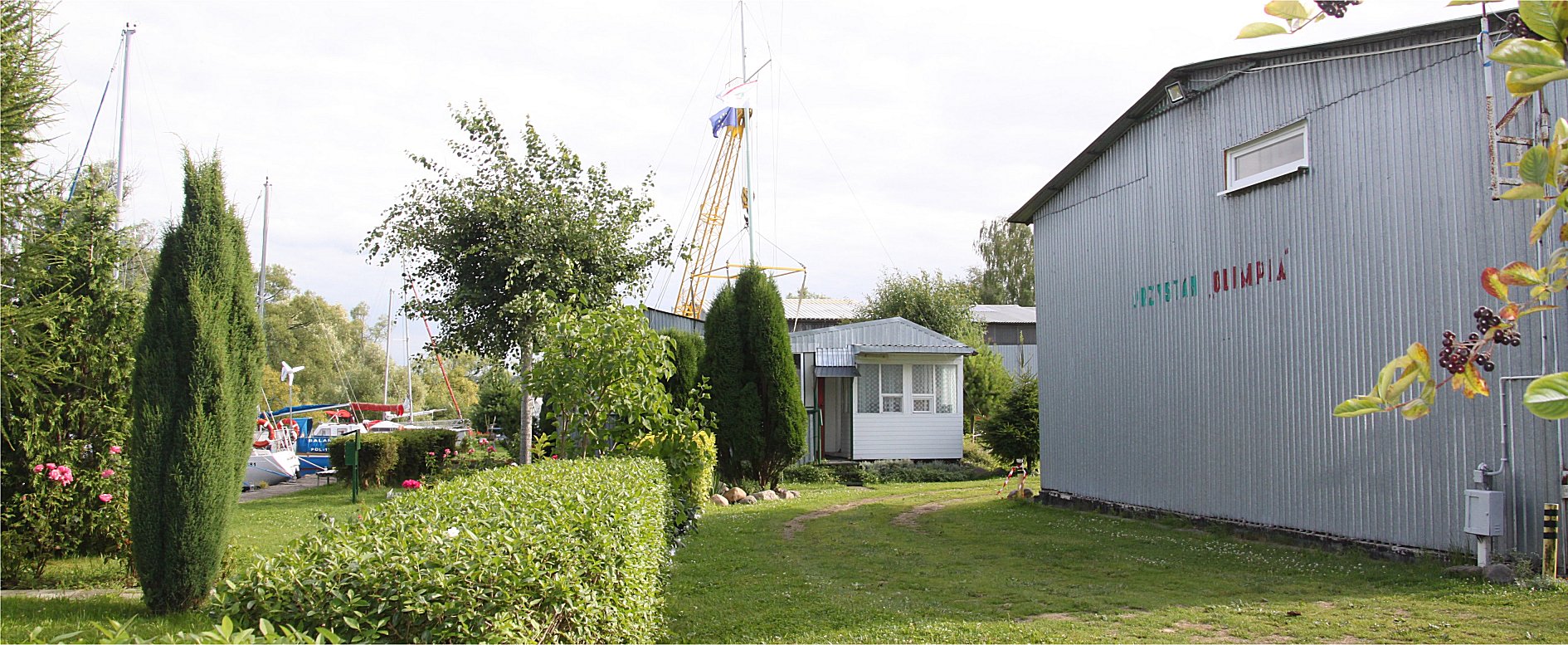 Drugą przystanią jest TKKF "OLIMPIA". To przystań rezydencka, niezbyt bogata, ale też utrzymana wzorowo. Istotna zaleta - żuraw nabrzeżowy o nie znanym mi udźwigu. Przyglądając się jednak ogromnym przeciwwagom - spore łódki moga być nim wodowane.