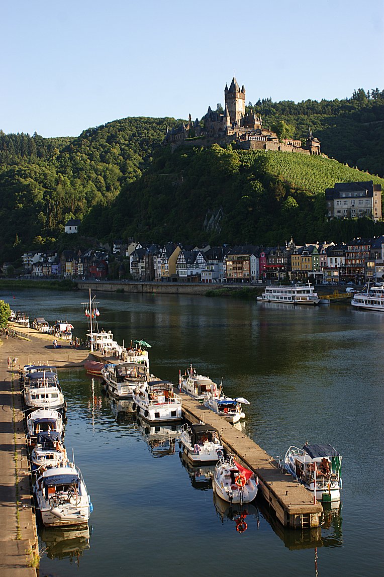 11. 21.07.2015; Cochem (Mozela - Niemcy); miejski port jachtowy w w nim „Ewa3”; w tle zamek Reichsburg;