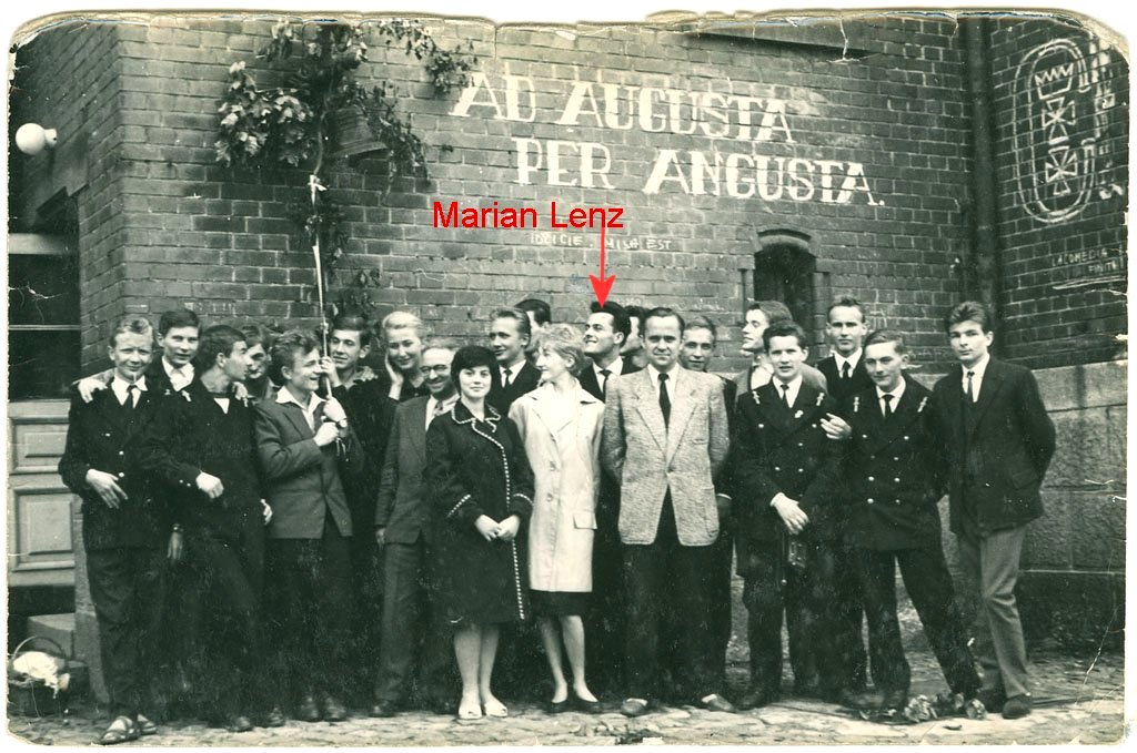 Było w zwyczaju, że po maturze wokół szkolnego dzwonu każdy rocznik pisał swoje zawołanie. W moim (1961) Irek wyszukał i kredą napisał łacińską maksymę: „Ad augusta per angusta” - którą można tłumaczyć wielorako i choćby: „do wzniosłych osiągnięć trudną ścieżką”. Tak powstało to zdjęcie!