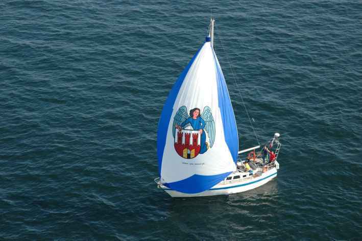 Potem Svaneke. Tu też brak sprzeciwu co do lotów (zdziwili się, że pytamy) i zapewnienia, że jeszcze nikt tego nie robił. Po dłuższym poszukiwaniu terenu do startu (musi być min. 50 m wolnego terenu) Jarek w powietrzu. Znów piękne zdjęcia portu z góry i cała sesja naszego jachtu - pod pięknym genakerem z herbem Torunia.