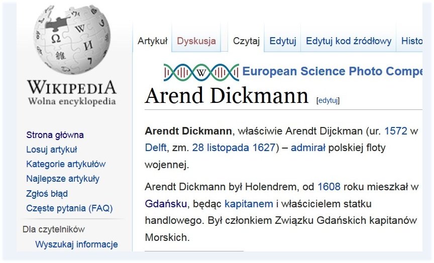 Otóż imię słynnego admirała Dickmanna pisze się już na tyle sposobów, że dobrze by było, by ustalić jakie było naprawdę! Spotkałem się już wersją: Arend, Arendt, Arnd i Arent. Nawet Wikipedia ma z tym kłopoty - inaczej jest w nagłówku, inaczej w - w notce (patrz - załącznik). Może więc ktoś ostatecznie rozstrzygnie te wątpliwości? Wszak to zasłużona dla naszej morskiej historii postać...