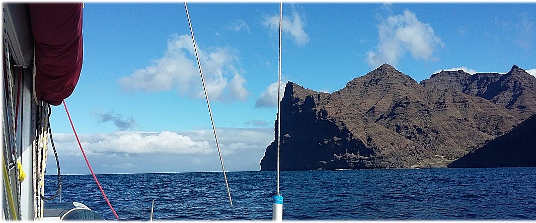 Następnego dnia moje dylematy dotyczące przybrania strategii dotyczącej drogi powrotnej na Teneryfę rozwiał Marek Tereszewski, forumowy Doktor z Żegluj net. Poradził, aby nie szukać kolejnego portu na Gran Canarii, ale podjechać na silniku maksymalnie na północ pod osłoną brzegu nadrabiając wysokości i wtedy najostrzejszym możliwym kursem przeciąć cieśninę oddzielającą nas od drugiej wyspy. Marku, wielkie dzięki – udało się nam przejść pod klifami 6,5 mili od Puerto de Mogan i tam, gdy strefa wiatru dotykając brzegu odcinając nam dalszą drogę, odłożyliśmy się prawym halsem na NW. Porwał nas w objęcia wiaterek 25-30 w, na szczęście lekko odchylony na E, dzięki czemu udało się utrzymać kurs 320. Fale oczywiście spychały nasz dziób w lewo, musiałem więc stale motywować młodych sterników do trzymania się jak najbliżej wiatru w ramach możliwości naszego zrefowanego foka.