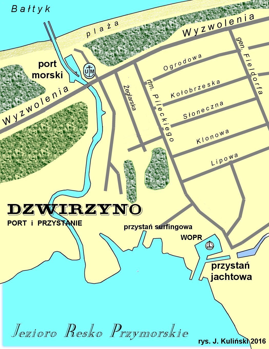 Ucieszyło mnie zainteresowanie tych Czytelników SSI, którzy zamierzają spróbować słonej wody - przepływając swymi mieczówkami z Mrzeżyna do Dzwirzyna. To konsekwencja newsa z dnia 17 czerwca 2016. Dzisiejsza prezentacja aktualnego planu porciku Dzwirzyno stanowi zapowiedź szerszego materiału, który ukaże się w "ŻAGLACH". Ale czerwiec już się kończy i najwyższy czas na pierwszy etap morskiego doświadczenia - żeglugę plażową. Brzeg morski jest piaszczysty, zaraz za Mrzeżynem w kierunku wschodnim miniecie 4 ostrogi palisadowe. Potem "czysta" plaża. Przed Dzwirzynem otróg będzie chyba 10.