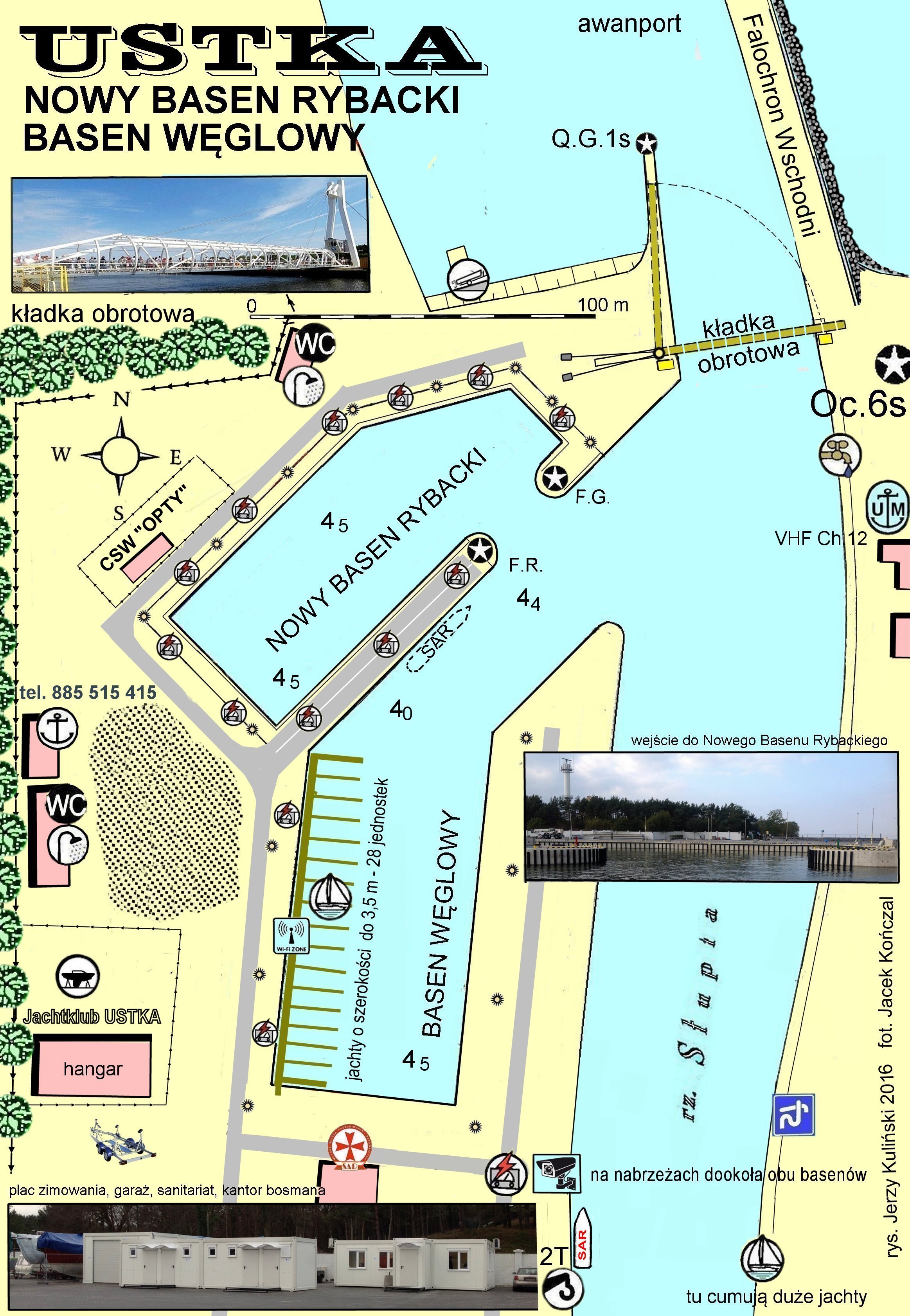 Póki co - zawiniecie do Basenu Węglowego, zacumujecie przy pomoście jachtowym przy nabrzeżu zachodnim. Tam wszystkie wygody i luksusy cywilizowanej Europy (drzwi otwiera zakodowany automat) w białym pawilonie. W biurze Zarządu Portu Morskiego Ustka (tamże) urzęduje pan Hubert Bierndgarski. Telefon komórkowy 885 515 415. Kompetentny, uczynny, sympatyczny. Kapitanem poru nadal jest Andrzej Rączka. Chyba już czas na niego.