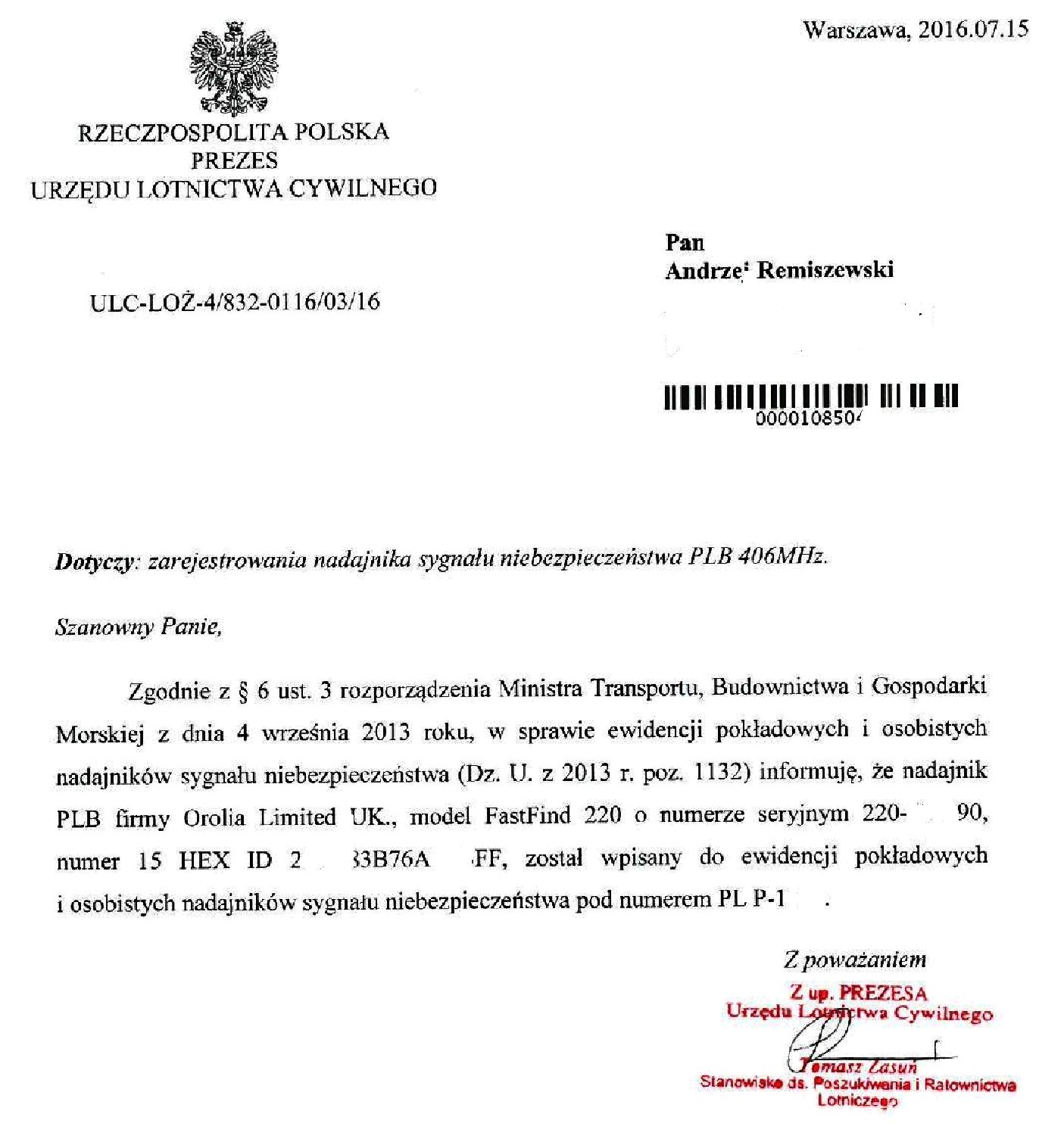 Niektórzy na stare lata mądrzeją. No choć troszkę. Postanowiłem więc nabyć PLB - osobistą radiopławkę. Sprzedawca dostarczył mi wypełniony druk zgłoszenia do rejestracji w Urzędzie Lotnictwa Cywilnego, łącznie z danymi kontaktowymi do elektronicznej wysyłki po wpisaniu swoich danych. W ferworze ostatniego dnia przed urlopem, wierząc, że sprzedawca udzielił mi kompletnej informacji,wpisałem te dane i bezzwłocznie wysłałem skan do ULC.