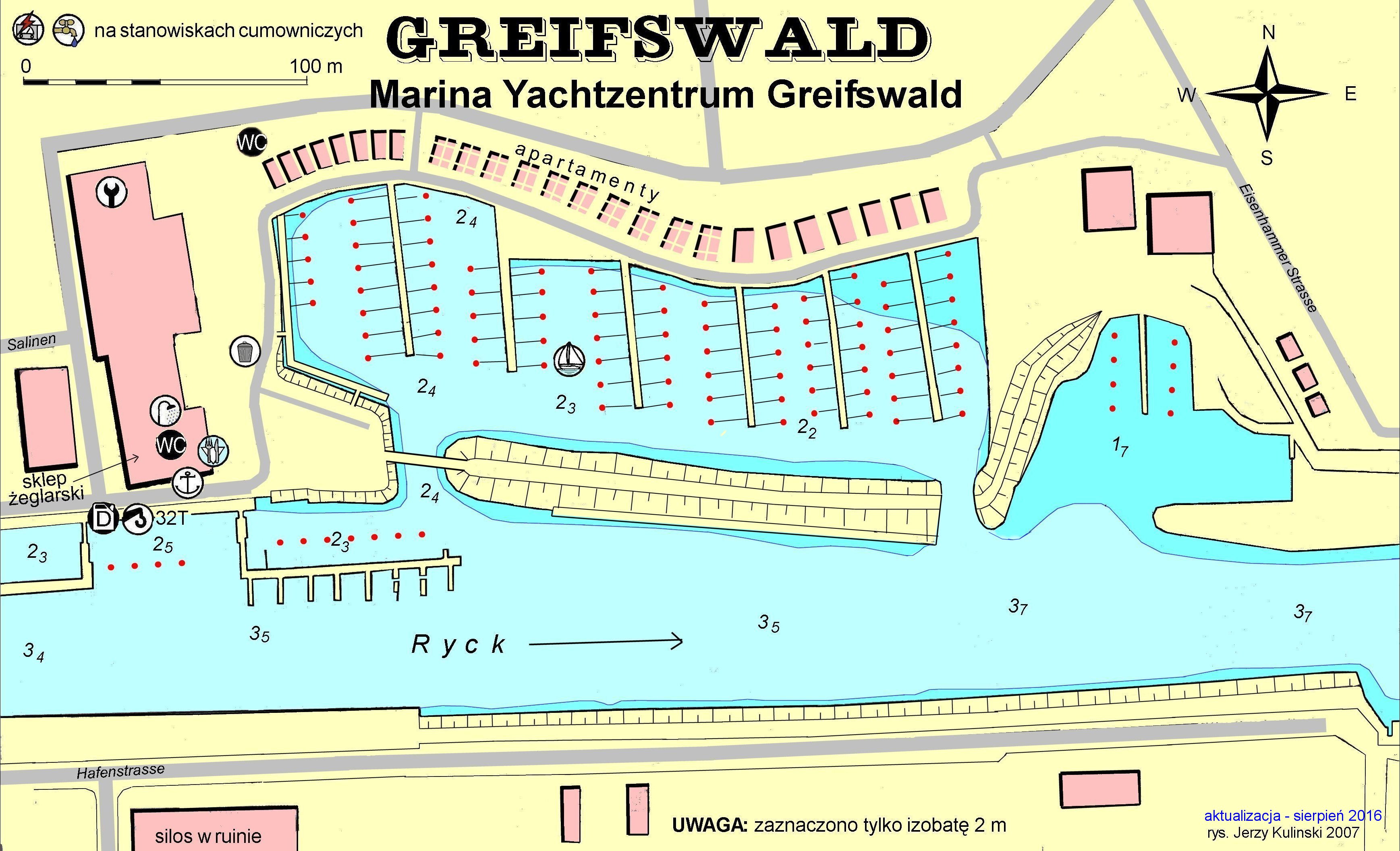 Również wejście do Mariny Yachtzentrum usytuowane jest obecnie w innym miejscu, jednocześnie zaznaczyłem lokalizacje bosmanatu, WC i miejsce