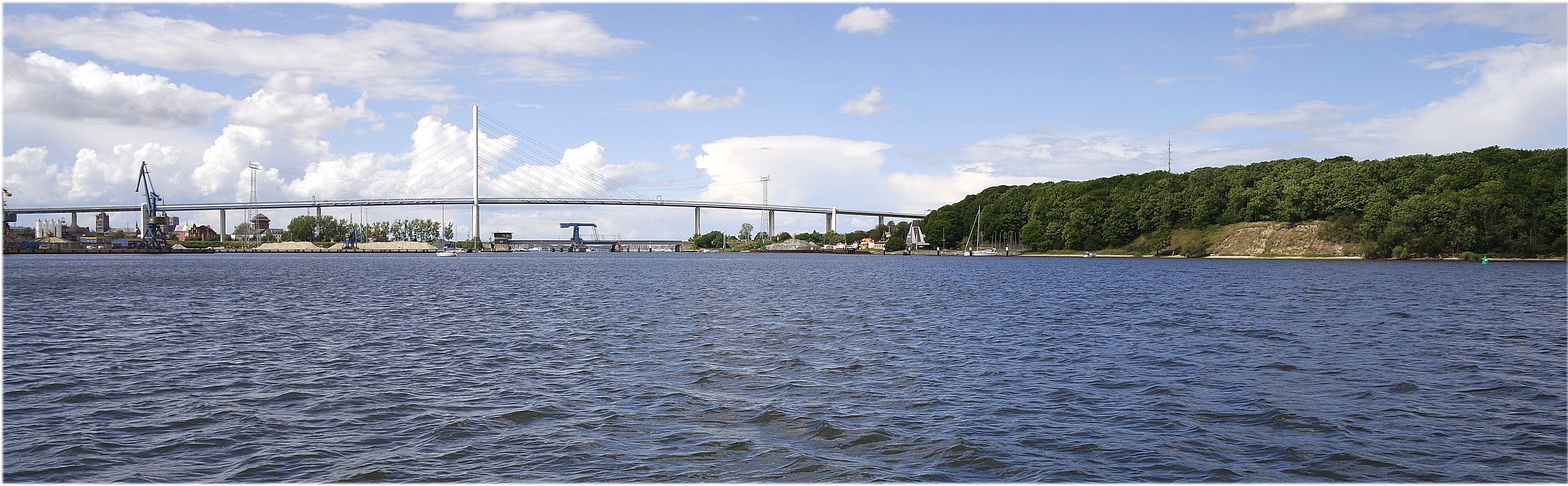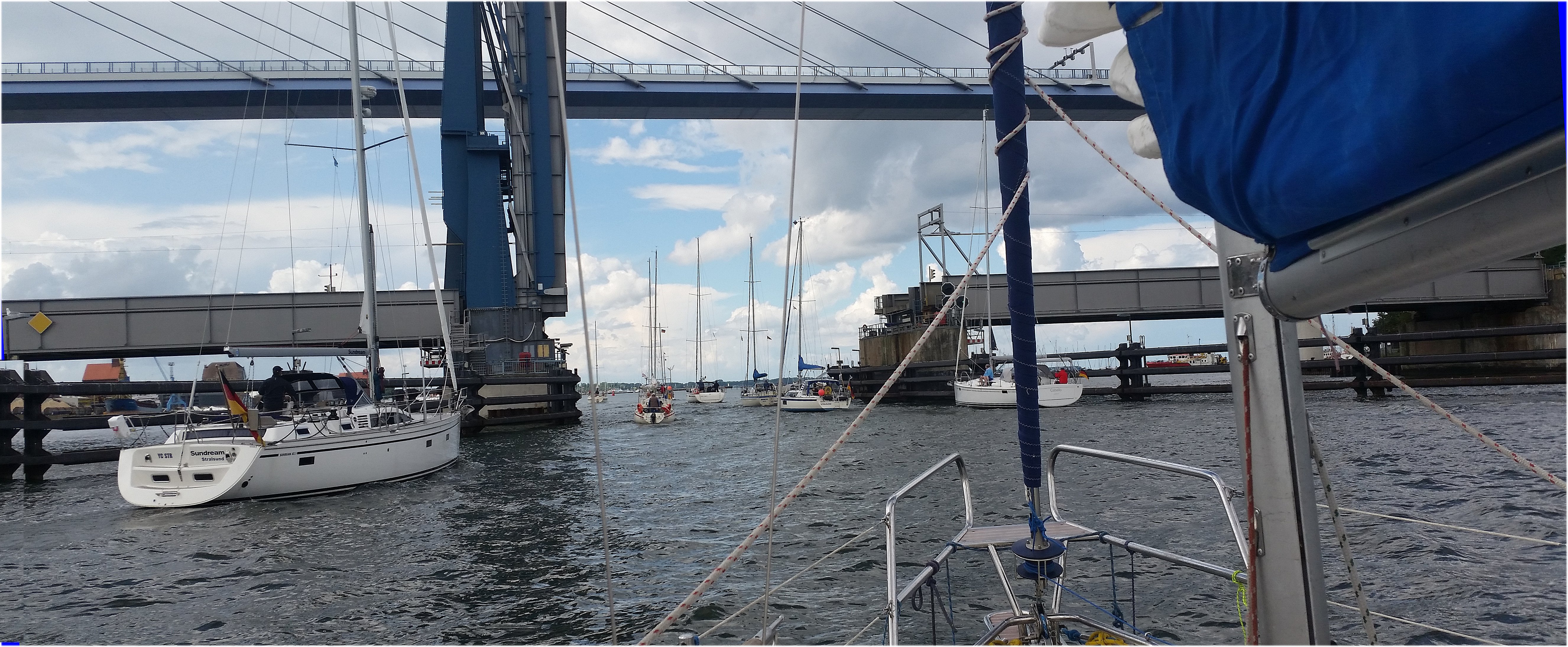 W dalszym ciągu Neptun nam sprzyja, więc bez problemów docieramy w pobliże ostatniego w tę stroną rejsu mostu zwodzonego. Nowoczesny, bardzo wysoki most, otwarty w 2007 roku łączący Rugie ze stałym lądem, prezentuje się okazale i nie jest żadną przeszkodą nawet dla jachtów z bardzo wysokimi masztami. Pozostaje do pokonania most, który na szczęście punktualnie i często jest otwierany. Mając jeszcze kilka minut czasu do jego podniesienia, w towarzystwie kilkunastu jachtów, oglądamy widoczne już z daleka Oceanarium i stojący przy nabrzeżu, jako muzeum żaglowiec Gorch Fock II.(dawny "Tawariszcz"), dodatkowo warto przeczytać http://www.kulinski.navsim.pl/art.php?id=2969&page=30 .
