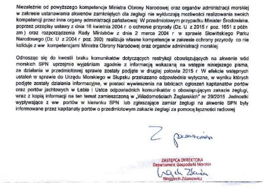 W przypadku Słowińskiego Parku Krajobrazowego mamy kolejny przykład uzurpowania sobie przez podmioty stanowiące ograniczenia dla parków krajobrazowych prawa do ich wprowadzania na obszarach morskich. Analogiczna sytuacja istnieje na obszarze Zatoki Puckiej, gdzie rozsądne zarządzenie DUM stoi w sprzeczności z uchwała Sejmiku Wojewódzkiego podjęta wedle naszej wiedzy w wyniku presji RDOŚ w Gdańsku.