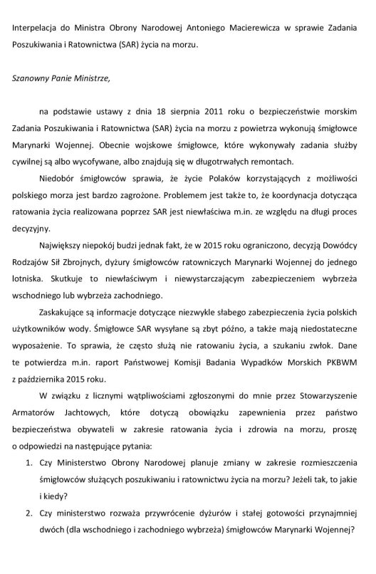 Twój news w którym między innymi opisana jest reakcja parlamentarzystów z pasa nadmorskiego naszego kraju na problem zanikającej, a w perspektywie braku, powietrznej służby ratowniczej SAR, opisuje sytuację, której być nie powinno.