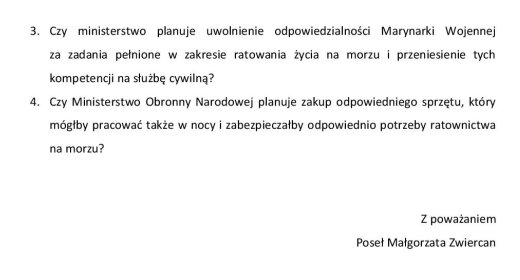 Jak dotychczas nastąpiła reakcja posłanki Małgorzaty Zwiercan, która złożyła interpelację do Ministra Obrony Narodowej. Załączamy ją do poczytania*). Oczekujemy na reakcje innych parlamentarzystów, w tym szczególnie członków Komisji Gospodarki Morskiej. A może tak żeglarze, którzy są zarazem wyborcami, zechcieliby pisać do swoich parlamentarzystów w tej sprawie?! I to obojętne, czy na nich głosowali, czy nie. Wszak jesteśmy dla nich suwerenem.