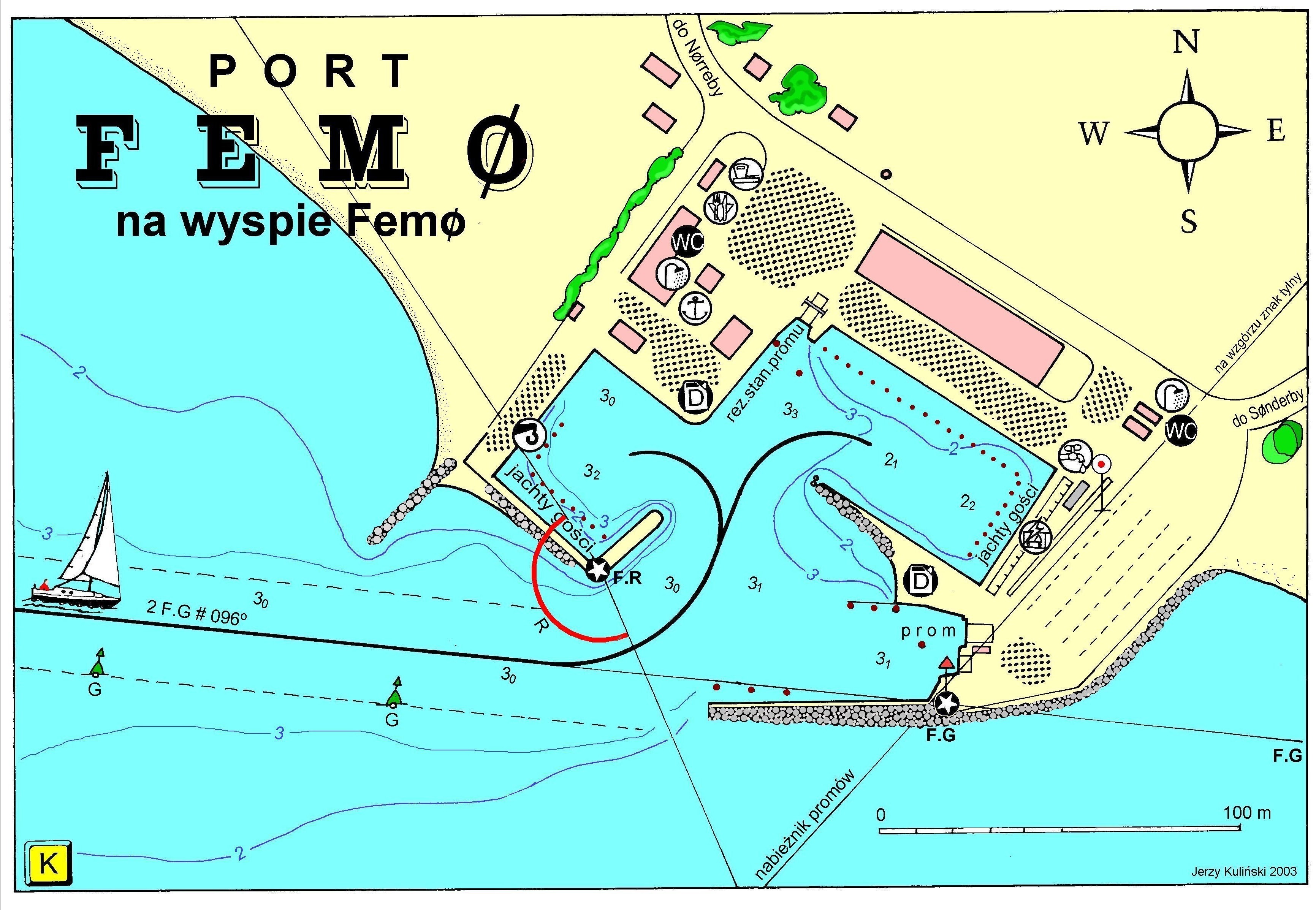Femø zapamiętałem szczególnie ze względu na to, że właśnie tam pewnej ciemnej, wietrznej i nieco deszczowej nocy przyszło nam szukać przytuliska. Samo szukanie, nawet w czasie tak marnej pogody w żegludze bałtyckiej nie jest niczym godnym specjalnej pamięci. Przybliżam tylko scenerię. Do Femø wcale nie mieliśmy zawijać, do Femø zagnał nas silny wiatr spod mostu Storstrombroen (między Zelandią i Falster. Uciekaliśmy w ciemność, zdani tylko na (nie)dokładność systemu Decca. Niecodzienność sytuacji polega na tym, że kiedy zmordowani żeglarze wreszcie znaleźli osłonę przed wiatrem – okazało się, że w panoramie jeszcze czarniejszego niż noc brzegu nic się nie świeci. Żadnej pary zielonych świateł nabieżnika, żadnego czerwonego światła na głowicy falochronu, żadnych latarni, świateł w oknach domów – nic, kompletna ciemność. Gdyby nie wskazania wspomnianego odbiornika nawigacyjnego – mógłbym zwątpić czy to, co nas osłoniło od wiatru jest właśnie wyspą Femø. Powolutku, na silniku, wciąż wytężając wzrok zbliżamy się do miejsca, w którym powinien być port.