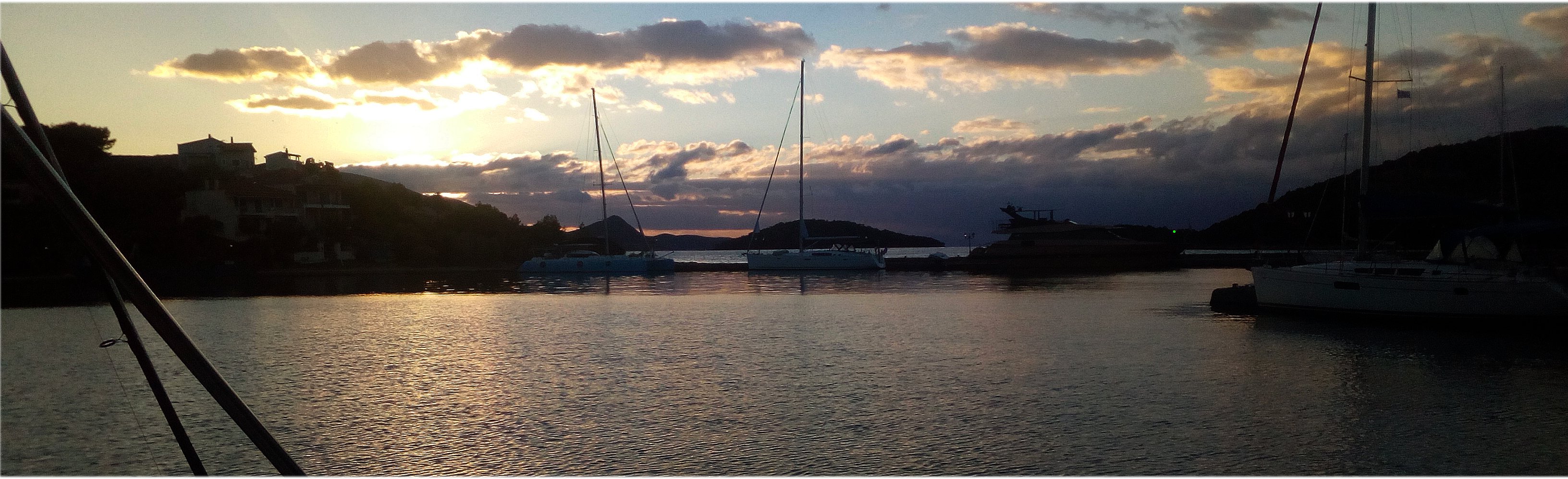 Wiadomo, że po błękitnych wodach pływa się od śniadania do podwieczorku kiedy jednak zbliżaliśmu się do Trizonii nasz podwieczorek wypadł poło drugiej w nocy.Wiało z rozmaczem. Ploter ploterem, ale sam mówisz, żeby jeszcze sprawdzić. O! Jest zielone. Więc wolniutko w stronę tego zielonego. Co prawda świeci stałym światłem a na ploterze żadnego światła nie ma, ale jednak zielone. Zresztą jedyne jakie widać w porcie. Na szczęście z bliska okazało się, że to prawoburtowe światło jachtu zacumowanego poza falochronem. A w porcie widać, że ktoś już się na ten zaciemniony porcik nabrał.