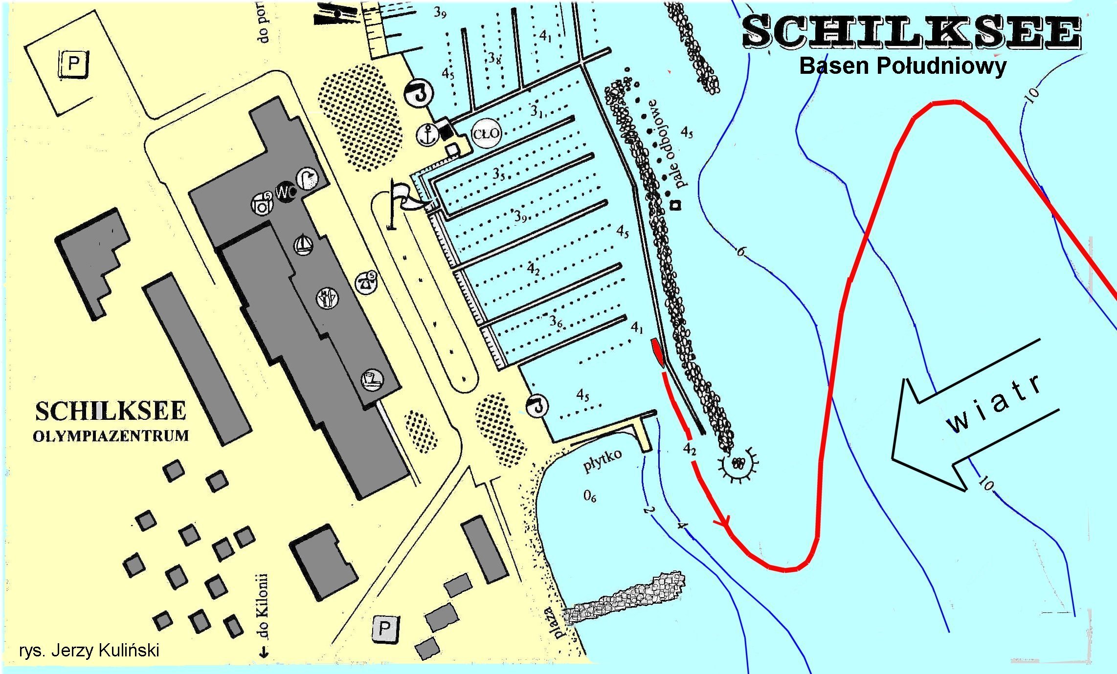 Do Schilksee weszliśmy po południu, pogoda nie robiła nam żadnych wstrętów. Staneliśmy "alongside" do nabrzeża falochronowego. Załoga klarowała jacht, a ja poszedłem "uiscić". Kantorek Hafenmeistra mieścił się na pięterku drewnianej, ażurowej wieżyczki skąd wszystkie stanowiska cumownicze było widać jak na dłoni. Po wymianie ukłonów padły zasadnicze dla sprawy naszego postoju pytania: