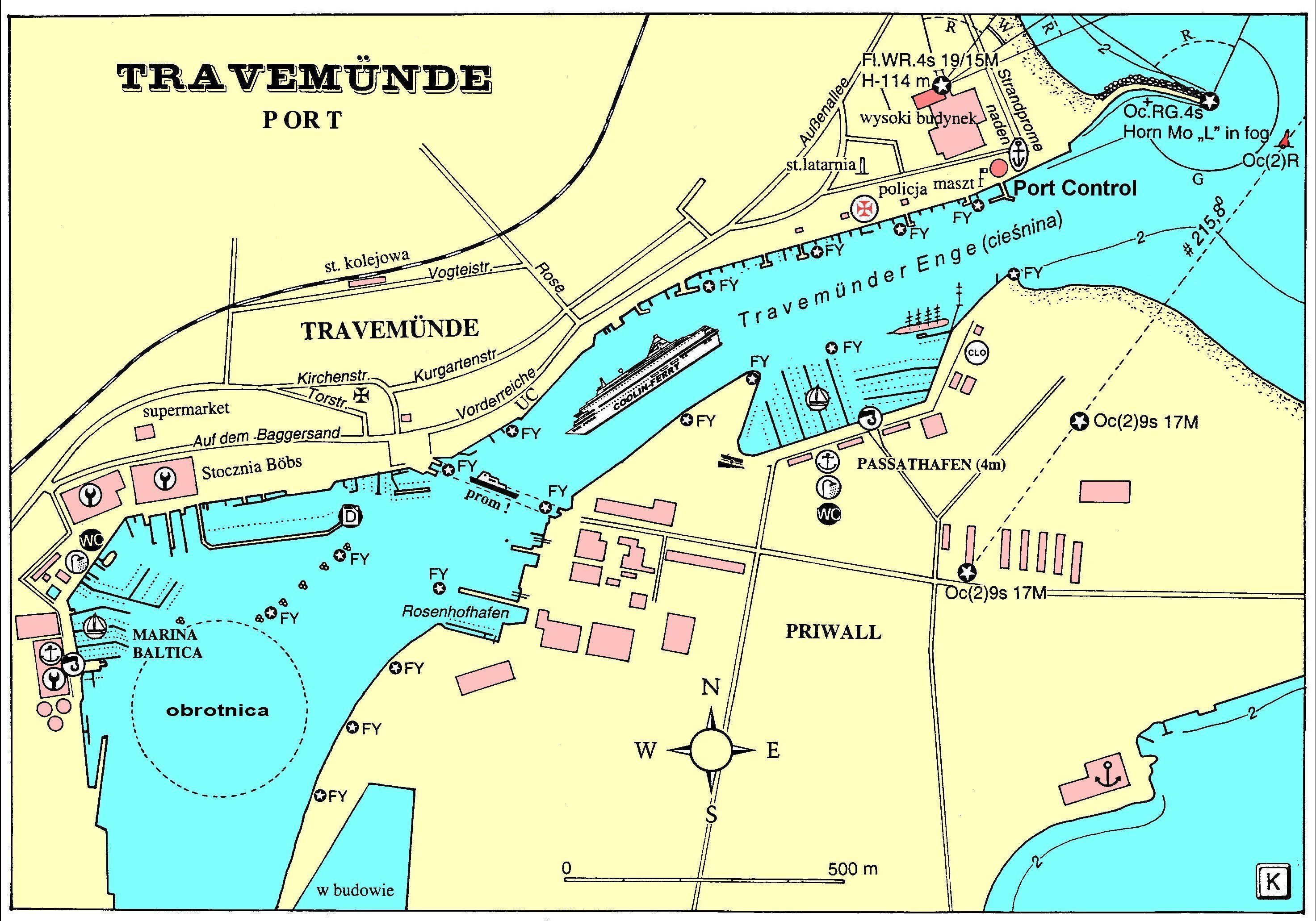 Szczegółowy opis Travemünde zawiera przewodnik Jerzego Kulińskiego „Wybrane porty Bałtyku”.