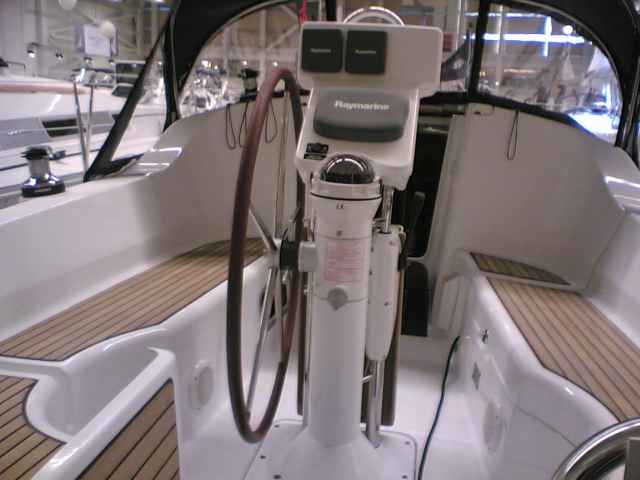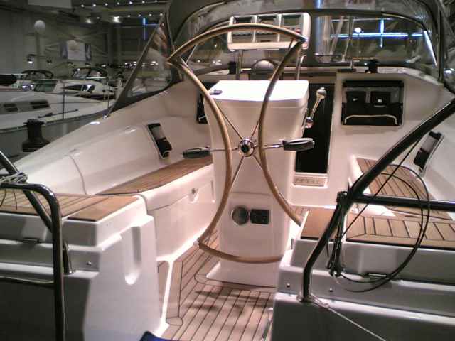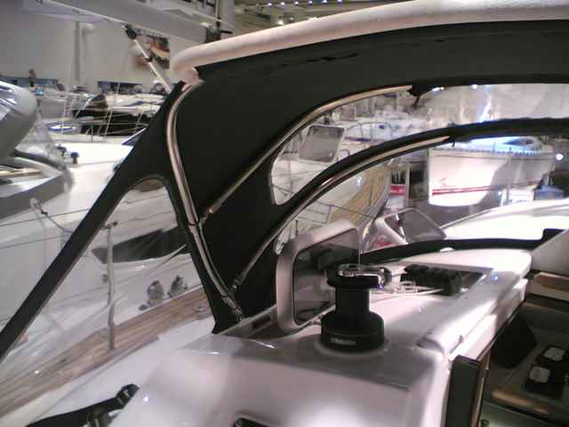 Jak wiadomo kazdy wlasciciel jachtu z kolem sterowym ma malo miejsca w kokpicie. Wiec wymyslili, ze mozna skonstruowac kolumne sterownicza tak, azeby kolo odchylalo sie w bok. Mozna tez skladac kolo sterowe tak jak na zdjeciu drugim – i tez zabiera znacznie mniej miejsca. Inna nowoscia sa owiewki. Z nimi byl zawsze problem, bo chronily slabo przed wiatrem i fala a parciany material wytrzymywal zaledwie kilka sezonow. Nowy typ zbudowany jest z mocnych rur z nierdzewnej stali, powleczony doskonalej jakosci materialem odpornym na deszcz i slonce a silne tasmy umocowuja go przed wiatrem.
