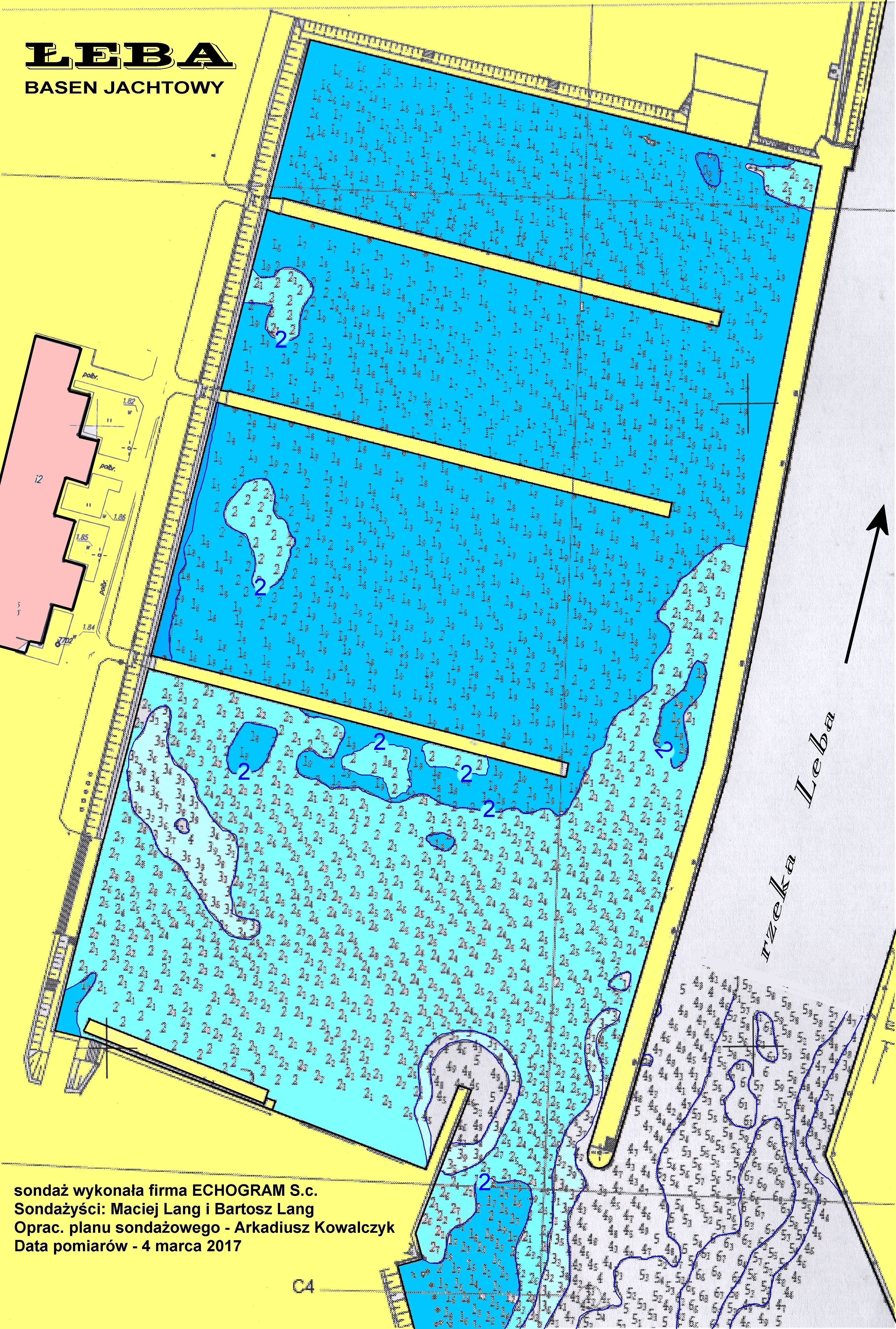 W załączniku przesyłam obiecany aktualny plan batymetryczny portu jachtowego w Łebie. Jak wół widać iż na wejściu do basenu jest płyciutko i obecnie