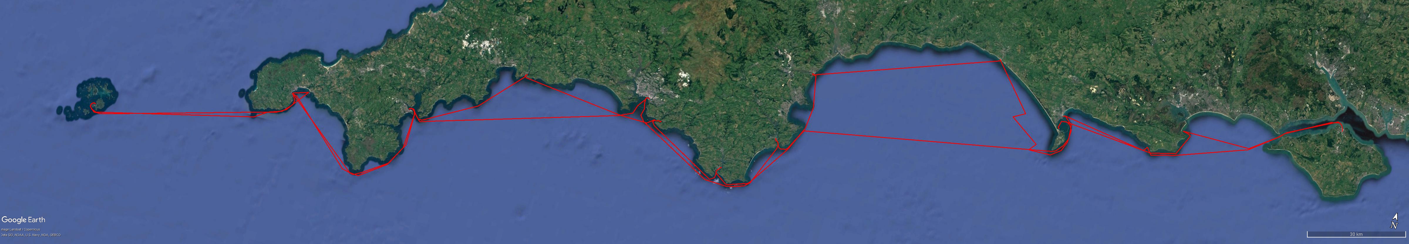 Podsumowując: Rejs miał charakter rekreacyjny – kolega zapowiedział na wstępie, że to ma być „oportunistyczne żeglowanie rodzinne, czyli płyniemy tam, gdzie wiatr pozwala, tak żeby było miło i wygodnie i żeby się nie uchepać. Zero fanatyzmu”. A więc, pływanie w dzień, zgodnie z prądami pływowymi, wchodzenie do portów po południu, zwiedzanie, obiad w pubie, zakupy, niezbędne prace naprawcze i porządkowe. Dzienne przeloty robiliśmy w zakresie od 23 do 65 mil. Refowaliśmy zawczasu. Przy słabych wiatrach, gdy prędkość jachtu spadała poniżej 3 węzłów, korzystaliśmy z silnika. Przepłynęliśmy w sumie 531 Mm, odwiedziliśmy 12 miasteczek. Niestety, trochę mało zwiedzaliśmy na lądzie, ograniczając się do podziwiania mijanych klifów. Cóż, 3 tygodnie to zbyt krótko na dokładniejsze poznawanie południowej Anglii i Kornwalii. Zaiste, warto odwiedzić tamte wody i porty, a nawet „przeskoczyć” La Manche na Wyspy Kanałowe i do Saint Malo. To bardzo ciekawa alternatywa dla chyba najbardziej odwiedzanego przez polskich żeglarzy Morza Śródziemnego.