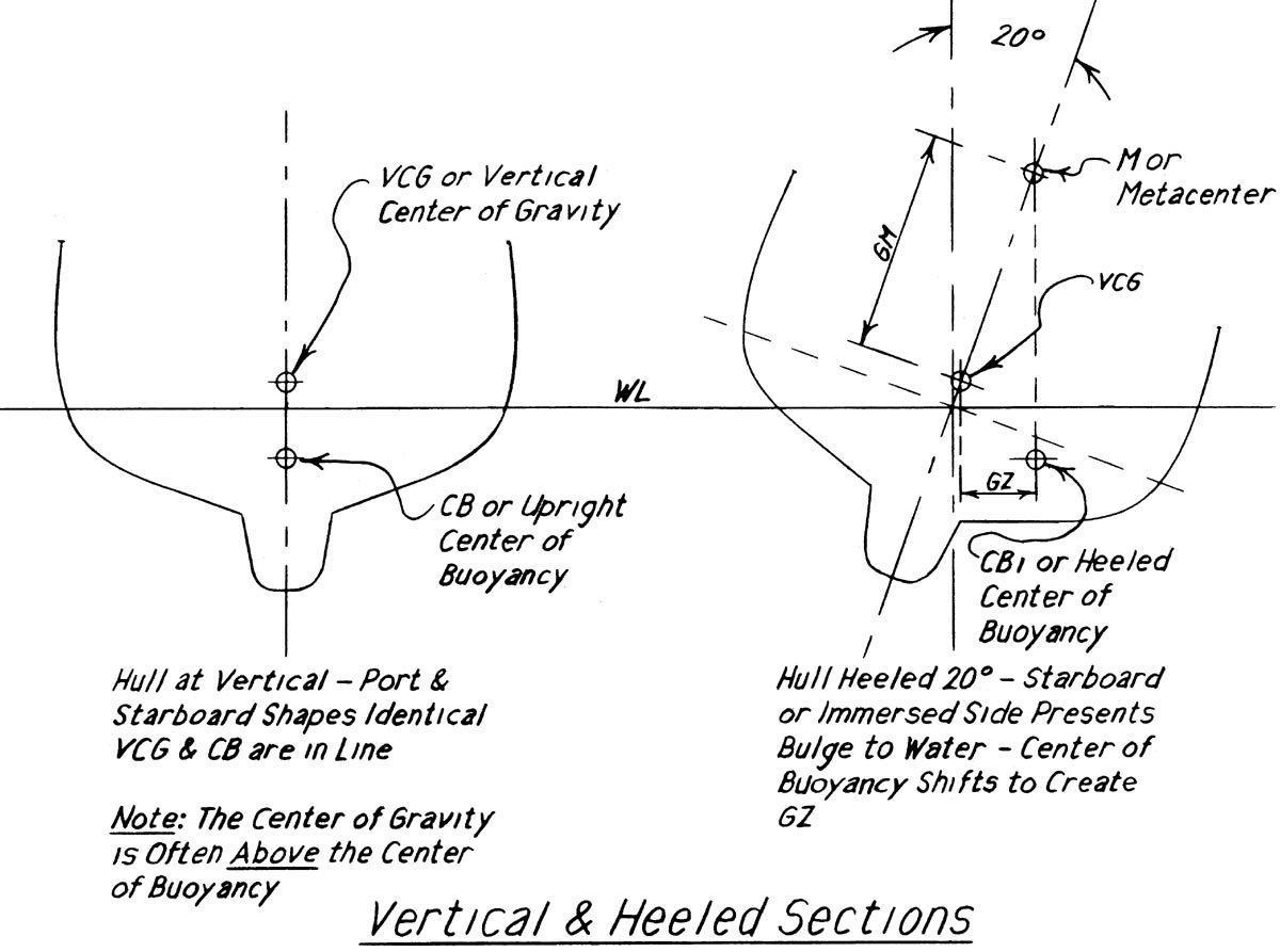 W przypadku, gdy jacht się nie przechyla, środek ciężkości G (ang. center of gravity) znajduje się w osi symetrii i w tej samej linii pionowej co środek wyporu (ang. center of buoyancy), niewiele powyżej. VCG - ang. vertical center of gravity określa położenie środka ciężkości w pionie (LCG lub longitudal center of gravity określa wzdłużne położenie ale przy rozpatrywaniu stateczności poprzecznej nie jest nam to potrzebne).