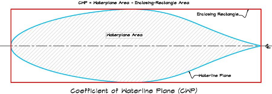 Najpierw musimy określić jednak inną wielkość. Na rysunku widać typowy kształt wodnicy wpisany w prostokąt o tej samej długości i szerokości. Stosunek powierzchni wodnicy do powierzchni tego prostokąta określa tzw. współczynnik wodnicy CWP. Jest on w miarę stały dla określonych typów jachtów: