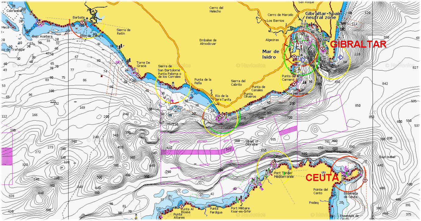 Poprzedni raporcik jak wiesz zakończył się na podejściu do Kadyksu, gdzie stanęliśmy na 12 godzin trochę determinowani pogodą i kierunkiem prądu w Cieśninie Gibraltarskiej. Intensywnie zwiedziliśmy te piękne miasto, łapczywie chłonąc klimat najstarszego hiszpańskiego portu i szukając zapachu prochu i atmosfery hiszpańsko - francuskiej floty stojącej tu w przeddzień bitwy pod Trafalgarem. Zaokrętowaliśmy naszego przyjaciela Kamila i w maksymalnej obsadzie 9 osób ruszyliśmy na wieczór do odległego o 70Mm Gibraltaru. Krótko po wyjściu z wysoką wodą prędkości jachtu przekroczyły 8 węzłów, by po kilku godzinach pod Cabo Trafalgar wyhamować łódkę do 2 węzłów. Taka to żegluga, raz daje raz zabiera. Moje wyliczenia co do samej cieśniny nie pozostawiały jednak wątpliwości i już niebawem jechaliśmy do przodu z prądem i prędkością dochodzącą do 9 węzłów. Te wyliczenia właśnie tu są bardzo istotne. Cała strategia pokonywania cieśniny polega na zgraniu czasu, prądu i kierunku wiatru aby żegluga była szybka i bezpieczna. W pewnych konkretnych sytuacjach i miejscach, szczególnie kiedy silny wiatr idzie przeciwko silnemu prądowi syzygijnemu, żegluga staje się powolna, niekomfortowa a w nawet niebezpieczna.