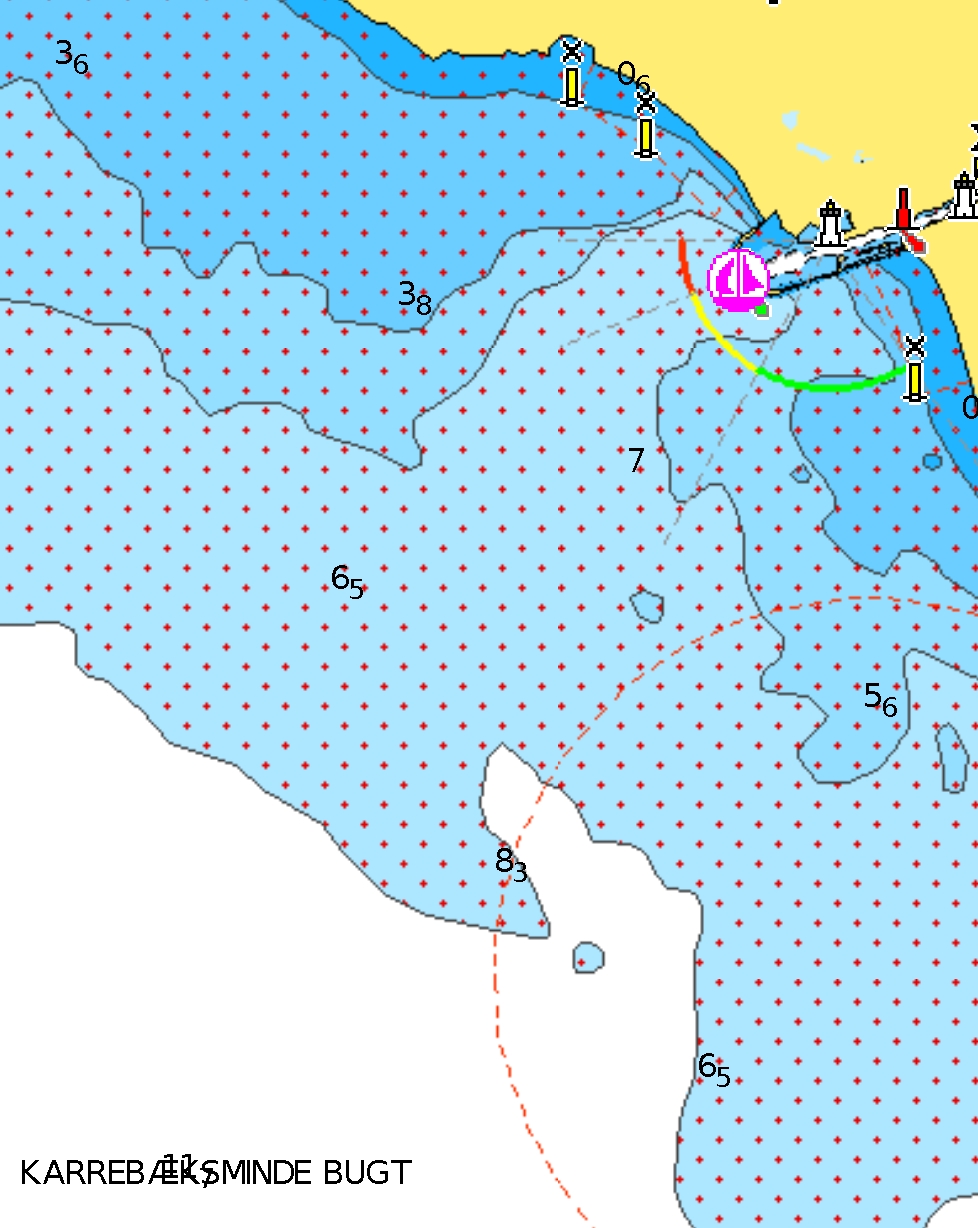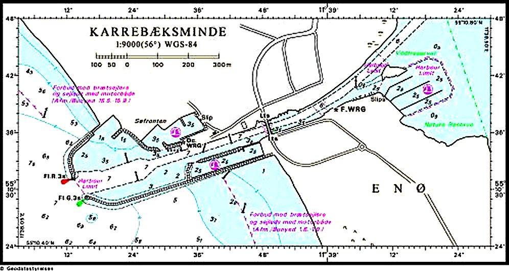 Wybraliśmy więc port wewnętrzny (Inderhavn). Manewrując w porcie trzeba uważać – za pławami czerwonymi głębokości spadają poniżej 1 m.. Skok pływu sięga 0,5 m,