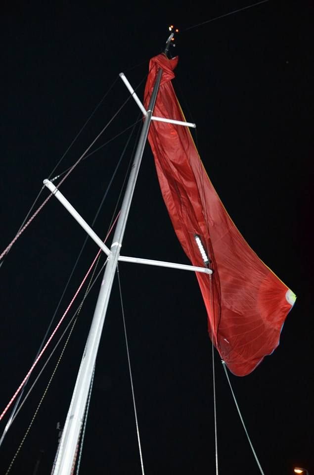 Alternatywy brak, ruszam, jakieś 4-5 godzin do portu. Po drodze zerkam co chwilę na powiewającego w górze spina i czasami sobie myślę, może niech się już urwie, będzie z głowy. Nic, trzyma i jakby miał z tego fun. 7NM do Władkowa i pierwsze wiadomości na telefon. Widzę, że moja załoga bardzo aktywna i ogarnia kwestie poinformowania rodziny i (!) już zorganizowała ekipę ratunkową do Władysławowa. Kurde, ja jeszcze nie pomyślałem co zrobię jak dopłynę, a oni, nie mając jeszcze pełnej informacji już organizują konkretną pomoc. Powiedzieć, że jestem pod wrażeniem czy nawet w szoku, to mało. Wow! Morale wraca na zielone pole i zaczynam być jakoś spokojniejszy. Tuż przed portem rozmawiam z chłopakami – wszystko ogarnięte, bosmanat wie, że będzie w nocy jacht z jednym żeglarzem na pokładzie i ze spinem na topie. Normalka ;-). Całe szczęście wiatr od lądu i port osłonięty. Podejście z emocjami nie większymi jak przy każdym nocnym wchodzeniu do portu. Marek z Michałem pokazują latarką miejsce do cumowania i już po chwili trzymają mnie za kosz dziobowy. Stoję w porcie, uff. Marek wręcza mi butelkę z dobrym trunkiem i witają mnie jakbym na metę wpłynął. Szczere miśki, radość, żarty z największej obecnie bandery na Bałtyku, emocje powoli puszczają. Michał wjeżdża na top i zajmuje mu tam około 40 minut aby spina wyzwolić. Klarujemy łódkę, siadamy w mesie i Michał grzebie w zapasach słodyczy, których na rejsie nie powinno zabraknąć. Odprowadzam Ratowników, bo przecież jest godzina 3 nad ranem w poniedziałek, a oni za chwilę do pracy muszą. Kładę się w koi i zasnąć nie mogę. Z boku na bok, przewijam film z ostatnich kilku godzin i nie do końca wierzę, że jestem we Władysławowie. Już po wszystkim? Gdzie moja Gotlandia? I chyba następne pytania są już we śnie. Następny dzień słoneczny i przyjemnie wietrzny.
