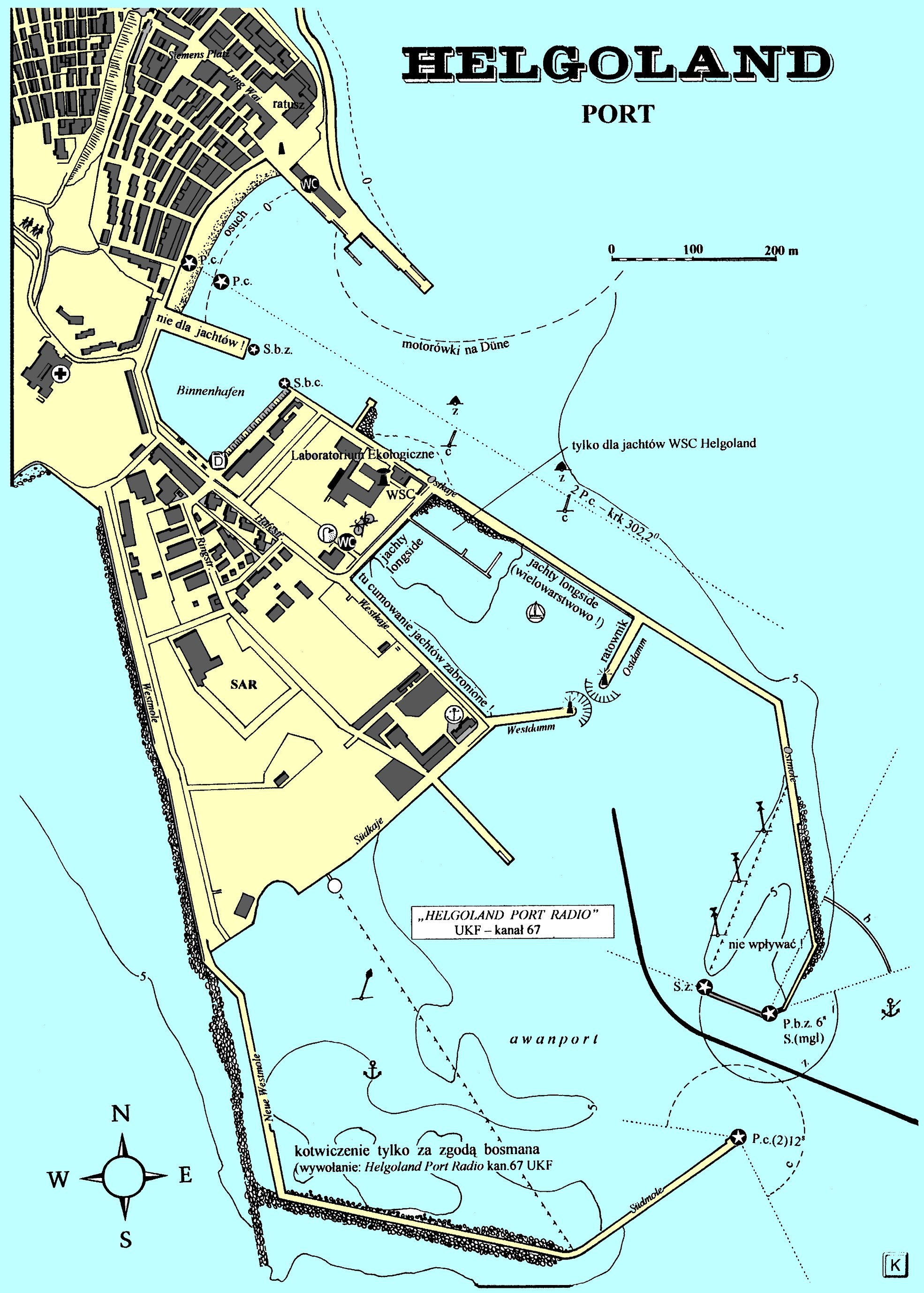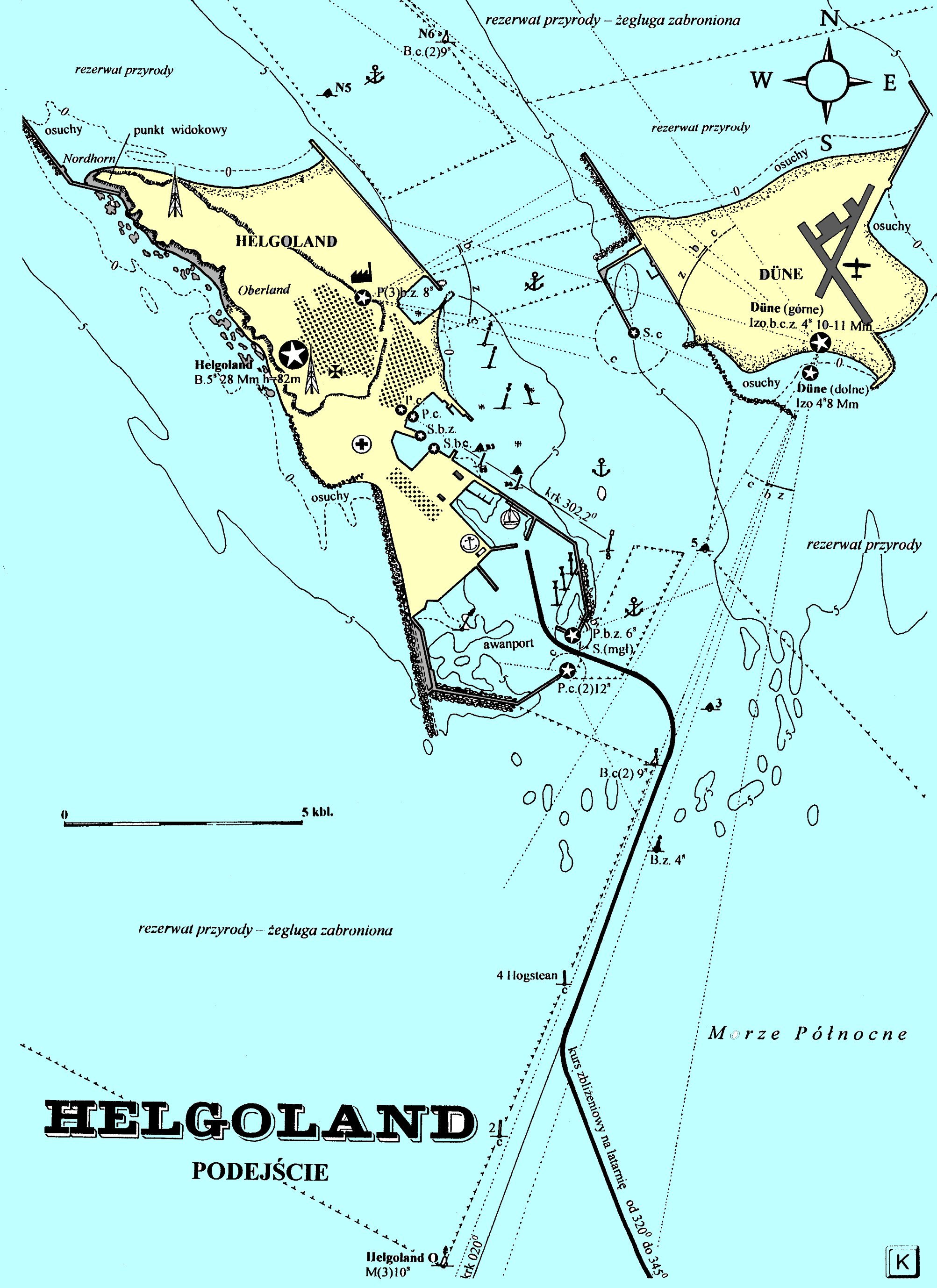 Rano, 20.07. niebo pochmurne, siąpi deszcz, ale wiatr, na szczęście, 4-5B z SE. Ruszamy z odpływem, a wraz z nami przeszło 20 dużych jachtów. Za główkami wszyscy, jakby na komendę, stawiają żagle i robi się biało jak na regatach. Cerberyna - Mila jest najmniejsza i najwolniejsza, więc co chwila ktoś wyprzedza nas. Na koniec majestatycznie przechodzi obok nas trzymasztowy żaglowiec holenderski, z wielkim banerem na rei, poświęconym 500-leciu reformacji. Na wysokości stawy Grosser Vogelsand kreślimy kurs wprost na Helgoland i włączamy autopilot. Pogoda zaczęła się poprawiać, widoczność lepsza, między chmurami prześwituje słońce. O 16.00 zaczyna majaczyć na horyzoncie wyspa. O 18.00 wchodzimy do awanportu Südhafen, czyli przedwojennej bazy Krigsmarine. Cumujemy burta w burtę na czwartego (12 E). Helgoland – tektoniczne wypiętrzenie skał, wielkości małego folwarku – 1 km2 powierzchni, ok. 3000 stałych mieszkańców. W XVIII w. sztormy i prądy pływowe oddzieliły wydmową wysepkę Düne. Dramatyczne dzieje, opisane w pasjonującej literaturze, Okruchy Historii: Helgoland – Malutka wysepka o wielkiej historii. Zob. http://okruchyhistorii.blogspot.com/2017/07helgoland-malutka-wysepka-o-wielkiej.html