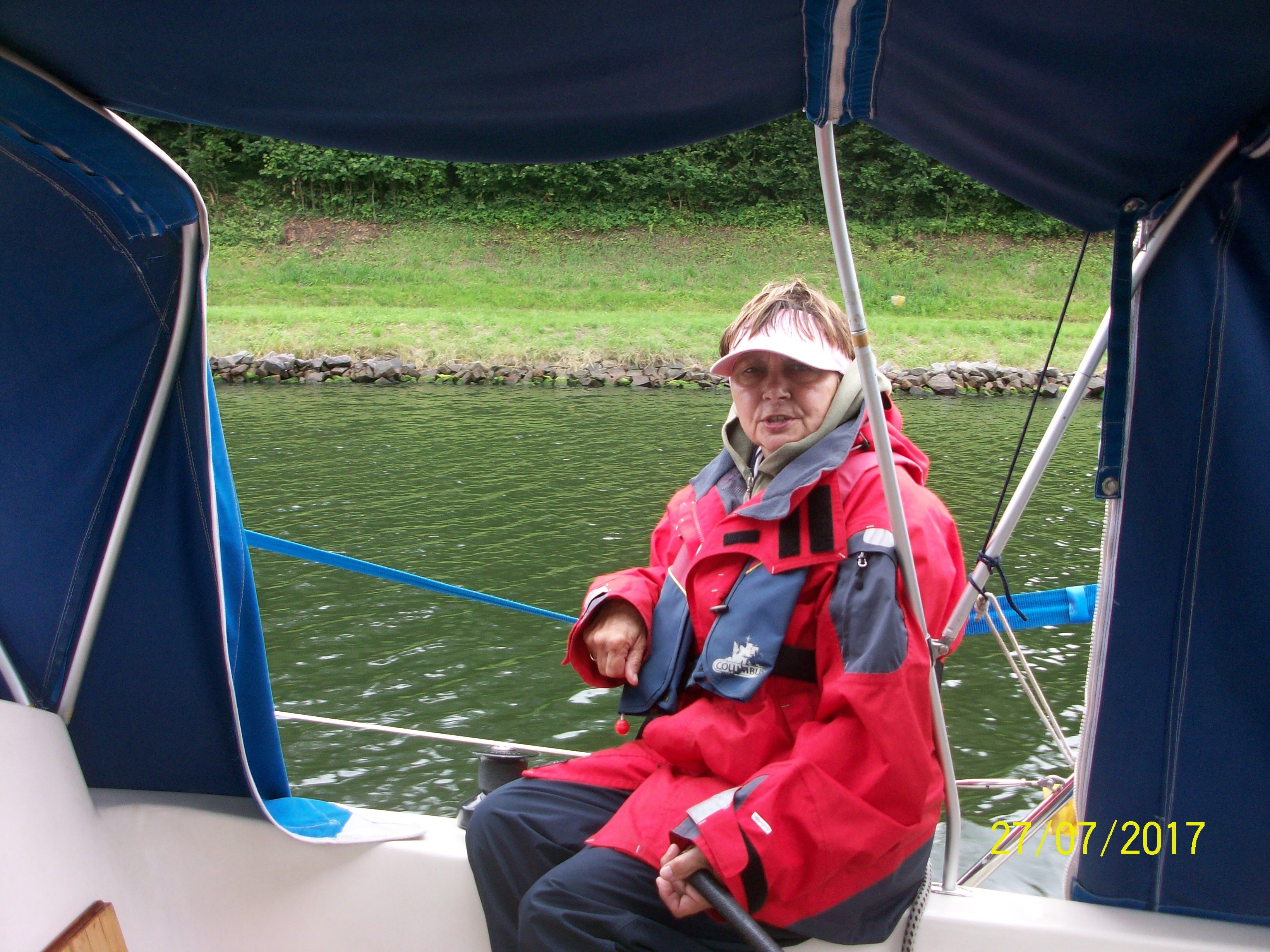 We wtorek, 25. 07, żegnamy Cuxhaven i w drugiej godzinie przypływu (11.00) ruszamy do Brunsbüttel. Warunki niezbyt korzystne. Wieje z SE 4B, w porywach do 5 – ostry bajdewind. Z niskich, czarnych chmur siecze deszcz. Wpływamy w otwarte wrota śluzy, przy silnym prądzie pływowym, znoszącym na prawą główkę. Na noc stajemy w przyśluzowej marinie (5,50 E). Ok. 17.00 pojechaliśmy z Jackiem Powałowskim na wystawny obiad. Dostaliśmy też wałówkę na drogę. Nazajutrz opuszczamy o 9.15 marinę i po 7 godzinach nudnej, kanałowej żeglugi, w deszczowej pogodzie, cumujemy w marinie Rader Insel, na 67 km Kanału Kilońskiego (10E). Wieczorem składamy życzenia wszystkim znajomym nam Annom i Hannom. Resztę kanału pokonujemy, pomagając sobie, zgodnie z przepisem, „jednym żaglem”. Przy wchodzeniu do śluzy Holtenau lunął deszcz i potężnie dmuchnęło, prosto w otwarte wrota. Cumowanie do śliskich, pływających pomostów utrudnione. Przed wieczorem stajemy w marinie Baltic Bay, w Laboe (15E).