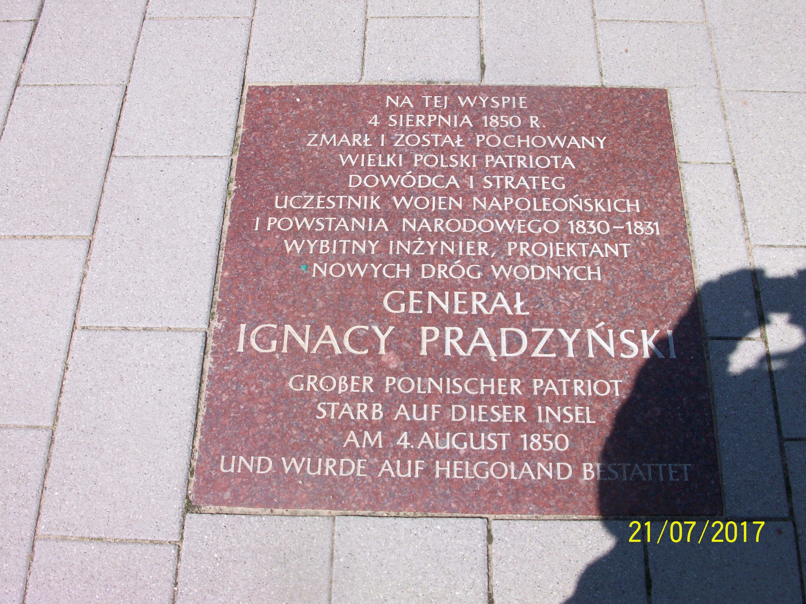 Wracamy na Helgoland i fotografujemy płytę, poświęconą gen. Prądzyńskiemu. Umieszczona jest w centralnym punkcie przy dworcu morskim, w doborowym towarzystwie – z prawej płyta cesarza Wilhelma II, z lewej płyta poety Heinricha Heinego i popiersie twórcy niemieckiego hymnu, Augusta Heinricha Hoffmana. Pomysł upamiętnienia generała wysunął pół wieku temu dr inż. Janusz Grochulski, dyrektor Centralnego Urzędu Gospodarki Wodnej. W 2000 r. temat podjęło Stowarzyszenie Inżynierów i Techników Wodnych i Melioracyjnych. W 2004 r. przedsięwzięcie zrealizowano, przy współudziale wielu polskich instytucji i stowarzyszeń oraz władz Helgolandu.