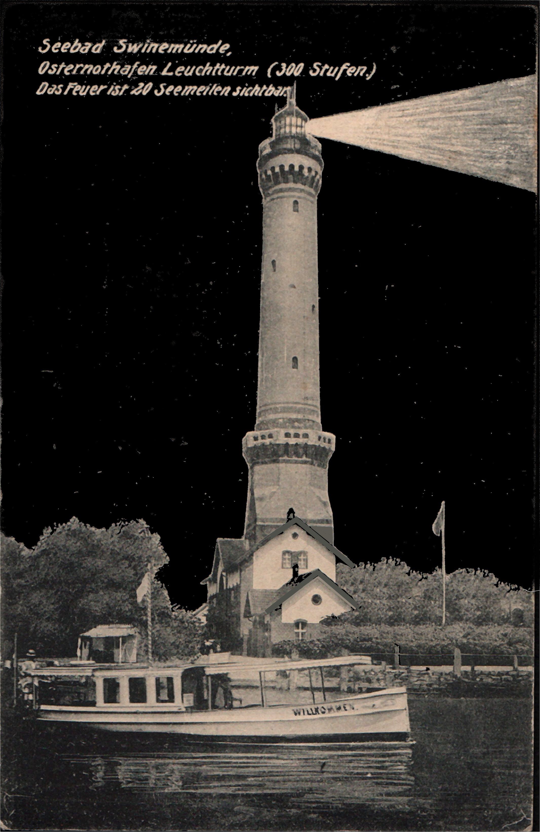 Podobne, nostalgiczne, skojarzenie mógł mieć wydawca pocztówki Sigmund Weil ze Szczecina, a którą wysłała ze Świnoujścia – dnia 29.07.1917 roku - panna Martha Heyer do Willy Krausego, nauczyciela. W czarnej nocy widać jasny błysk tej latarni; pod nią stoi wyglądający jak karawan (?), stateczek „Willkommen” („Witaj”) – „Salve, Regina, …” nasuwa mi się samo.