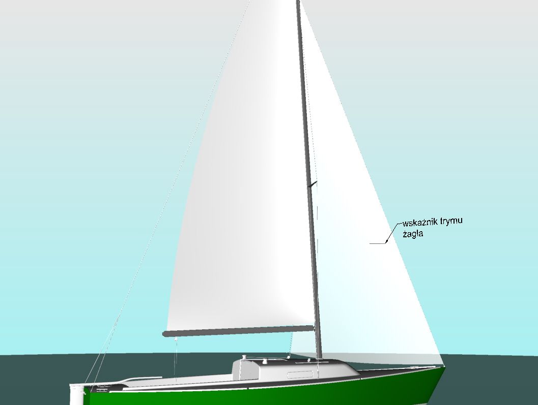 Ilość wskaźników trymu i ich rozmieszczenie może być mniej lub bardziej skomplikowane. Dla uproszczenia zalecam umieszczenie tylko na żaglu przednim jednego wskaźnika, mniej więcej w 1/3 wysokości żagla w odległości około 15cm od sztagu. Oczywiście większa ilość wskaźników pozwala nam na bardziej precyzyjny trym żagla, ale w pływaniu turystycznym rozprasza, lub zmusza do większej koncentracji. W sklepach żeglarskich można bez problemu kupić naklejane wskaźniki. Jeśli o tym zapomnieliśmy, to proponuję proste rozwiązanie. Trzydziesto centymetrowy kawałek syntetycznej wełny w ciemnym kolorze, przewlekamy z pomocą dużej igły przez żagiel i w jej połowie z obu stron żagla zawiązujemy supełki. Wskaźnik gotowy.