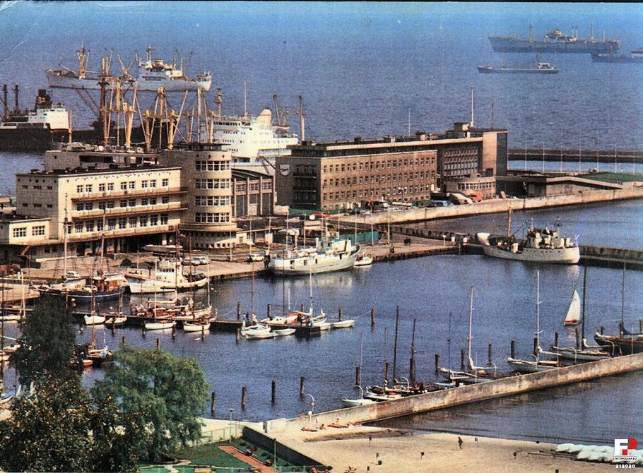 Fig_10_Druga połowa lat 70 – przed budynkiem Wyższej Szkoły Morskiej prawdopodobnie „Henryk Rutkowski” już w rękach „Bractwa Żelaznej Szekli”, statek ratowniczy „R3” oraz statek szkolny typu „Horyzont”, w rogu trawler badawczy MIR „Birkut” – z Internetu