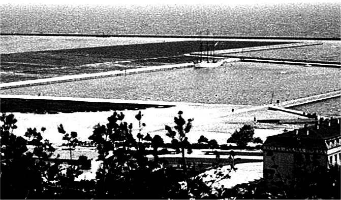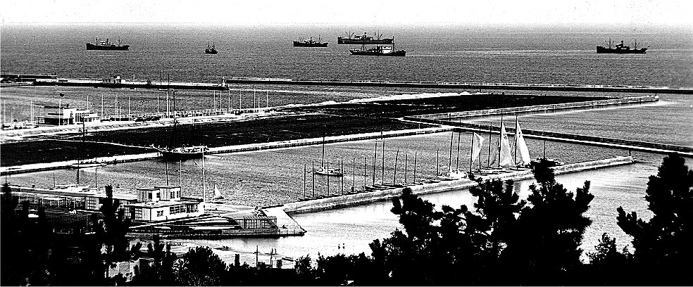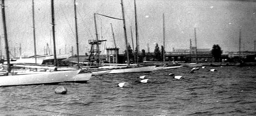 Basen powstał pod koniec lat 30, jak to wyglądało można zobaczyć na zdjęciu. Był obliczony na około 50 jachtów, które stawały rufą do kei i dziobemna boi lub kotwicy. W niesprzyjających warunkach można było wykorzystać boję manewrową na środku, podejść do niej, a potem zawieźć bączkiem podprowadzonym przez bosmana cumę na ląd. Pamiętajmy, że silników nie było! Podjęto też budowę Domu Żeglarza, którą wojna zastała w stanie surowym.
