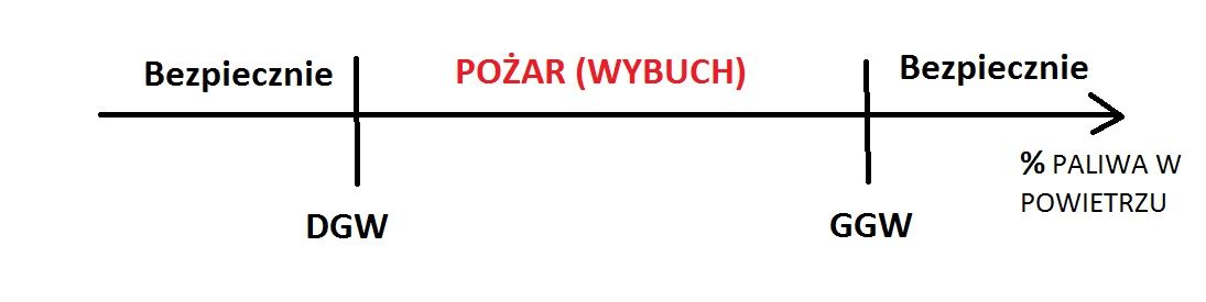 · Dolna granica wybuchowości (DGW): jest to najniższe stężenie paliwa w mieszaninie palnej (u nas w powietrzu), poniżej którego nie jest możliwy zapłon tej mieszaniny pod wpływem czynnika inicjującegoi dalsze rozprzestrzenianie się płomienia. Czyli za mało paliwa w mieszaninie, żeby się zapaliło.