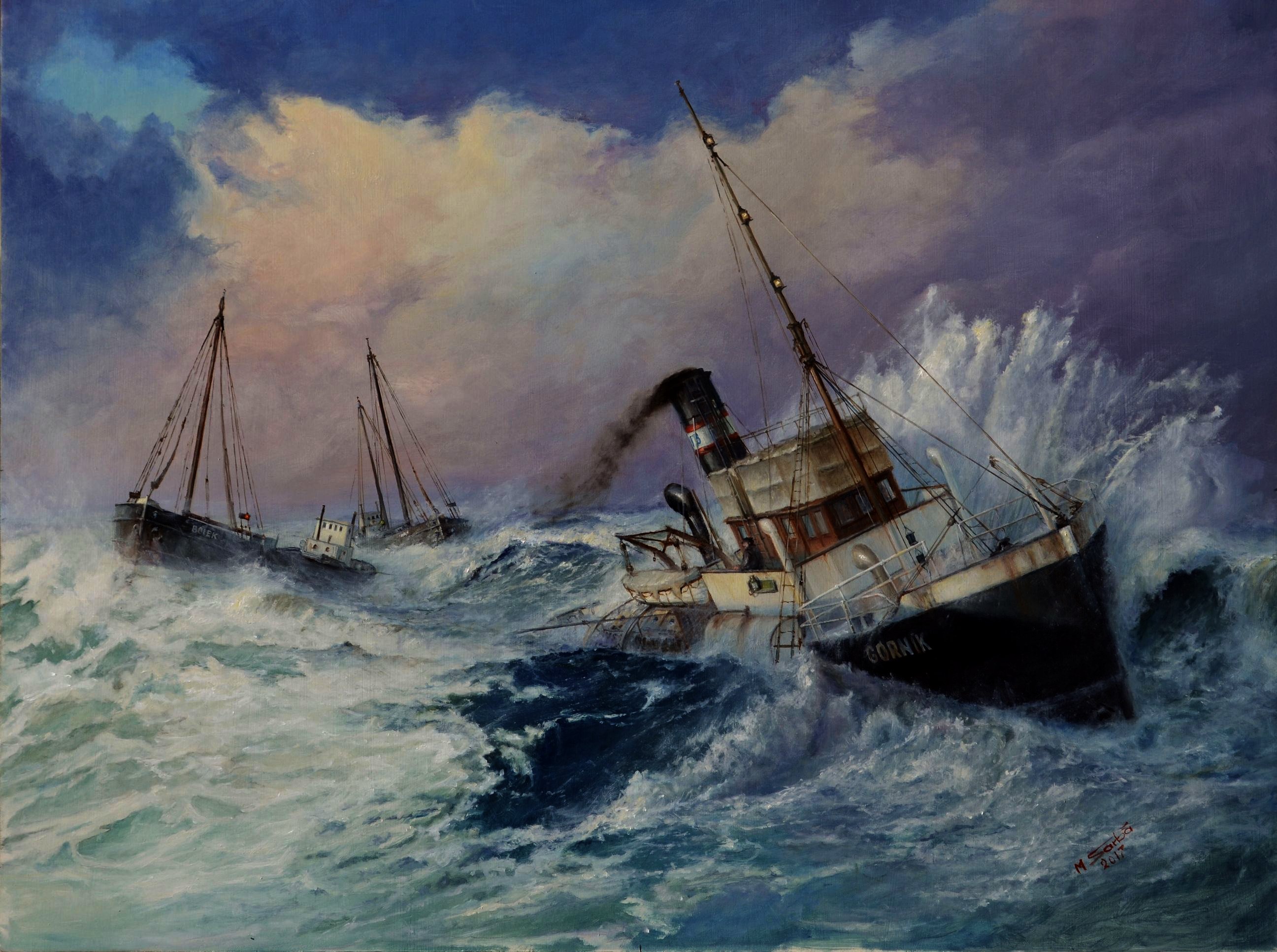 W obrazie zachwycająca jest logika odwzorowania szczegółów. Zwróćcie uwagę na kierunek fal i wiatru. Tego doświadczałem w najcięższych sztormach – fale są zewsząd, a bardzo mocny wiatr z jednego kierunku. Obejrzałem archiwalne fotografie holownika „Górnik”, pływającego jeszcze pod nazwą "Galata". Rzeczywiście nad sterówką znajdował się dodatkowy pokład (flybridge), którego relingi obciągnięte były mocnym brezentem. Widać jak bardzo jest naprężony pod naporem wiatru wiejącego trzy czwarte od dziobu. Dramaturgii przydaje czarny warkocz dymu z komina – dla każdego, kto choć przez chwilę miał do czynienia z kotłami parowymi jest jasne, że to jest ten moment, kiedy ruszty świecą na biało-błękitno, a kocioł pracuje na granicy eksplozji.