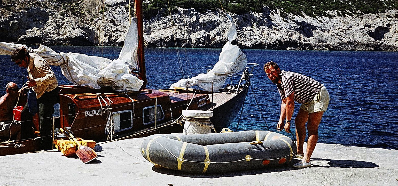 4. 1975, wysepka Bisevo k/Vis, SFRJ. Pierwszy samodzielny rejs Henia na „Ślimaku”. Na zdjęciu przygotowuje ponton do wycieczki, do Modrej Spilji – Błękitnej Jaskini.