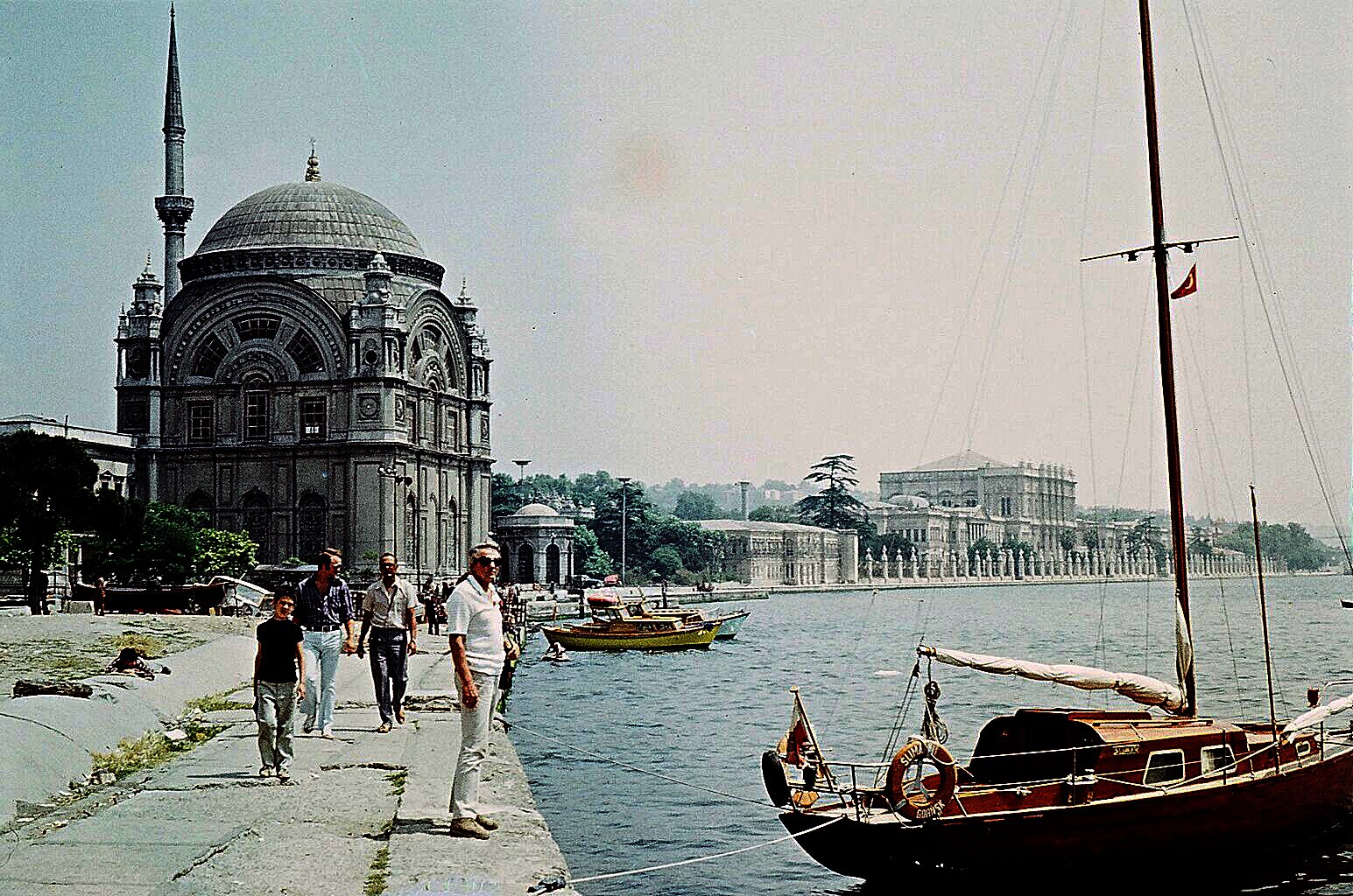 3. 1974, Stambuł. Henio robi mi (w środku) zdjęcie na tle meczetu Ortakoy. Tak się wówczas stawało na Bosforze; po prawej załogant Jan Bieżyński.